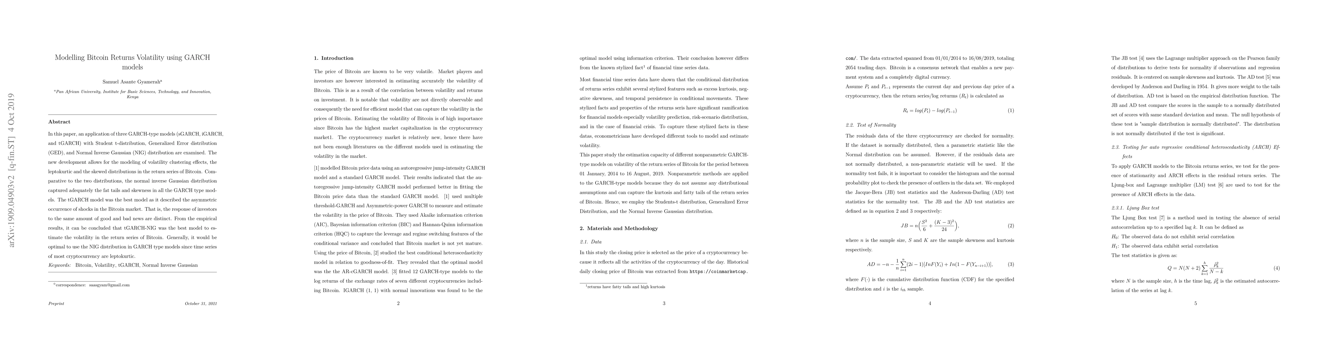 In this paper, an application of three GARCH-type models (sGARCH, iGARCH, and tGARCH) with Student t-distribution, Generalized Error distribution (GED), and Normal Inverse Gaussian (NIG) distribution are examined. The new development allows for the modeling of volatility clustering effects, the leptokurtic and the skewed distributions in the return series of Bitcoin. Comparative to the two distributions, the normal inverse Gaussian distribution captured adequately the fat tails and skewness in all the GARCH type models. The tGARCH model was the best model as it described the asymmetric occurrence of shocks in the Bitcoin market. That is, the response of investors to the same amount of good and bad news are distinct. From the empirical results, it can be concluded that tGARCH-NIG was the best model to estimate the volatility in the return series of Bitcoin. Generally, it would be optimal to use the NIG distribution in GARCH type models since time series of most cryptocurrency are leptokurtic.
