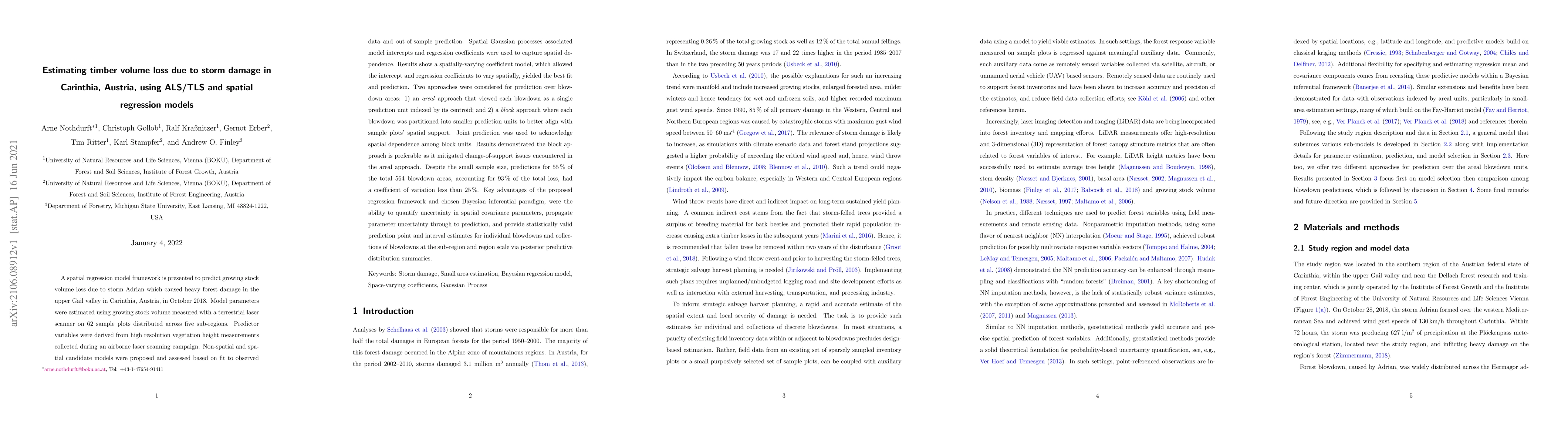 This paper presents a spatial regression model to estimate timber volume loss from storm damage in Carinthia, Austria, using ALS/TLS data. The model, which incorporates spatial Gaussian processes, showed superior fit and prediction compared to non-spatial models, especially when employing a block approach for prediction over damaged areas.