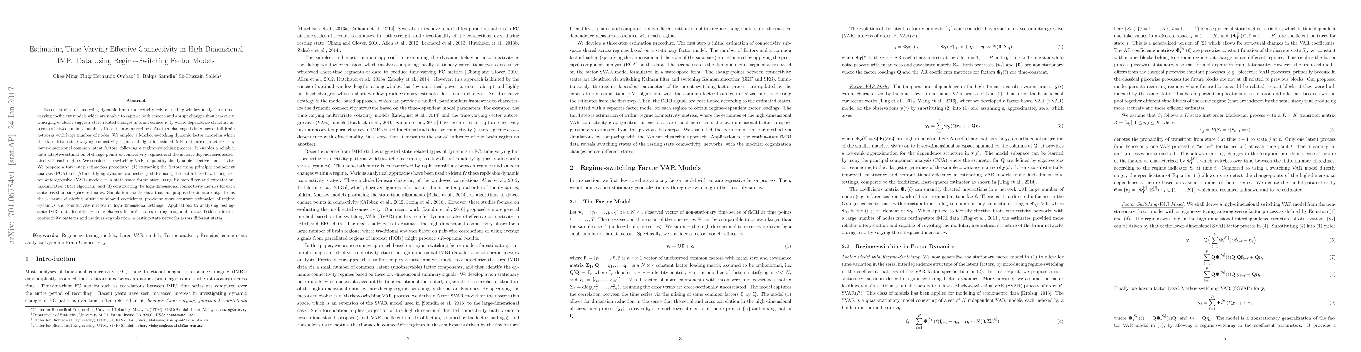 This paper proposes a Markov-switching dynamic factor model to estimate time-varying effective connectivity in high-dimensional fMRI data, capturing both smooth and abrupt changes in brain connectivity. The method uses PCA for factor extraction, followed by state-space VAR models for regime identification, and subspace estimates for connectivity metrics, outperforming traditional methods in simulations.