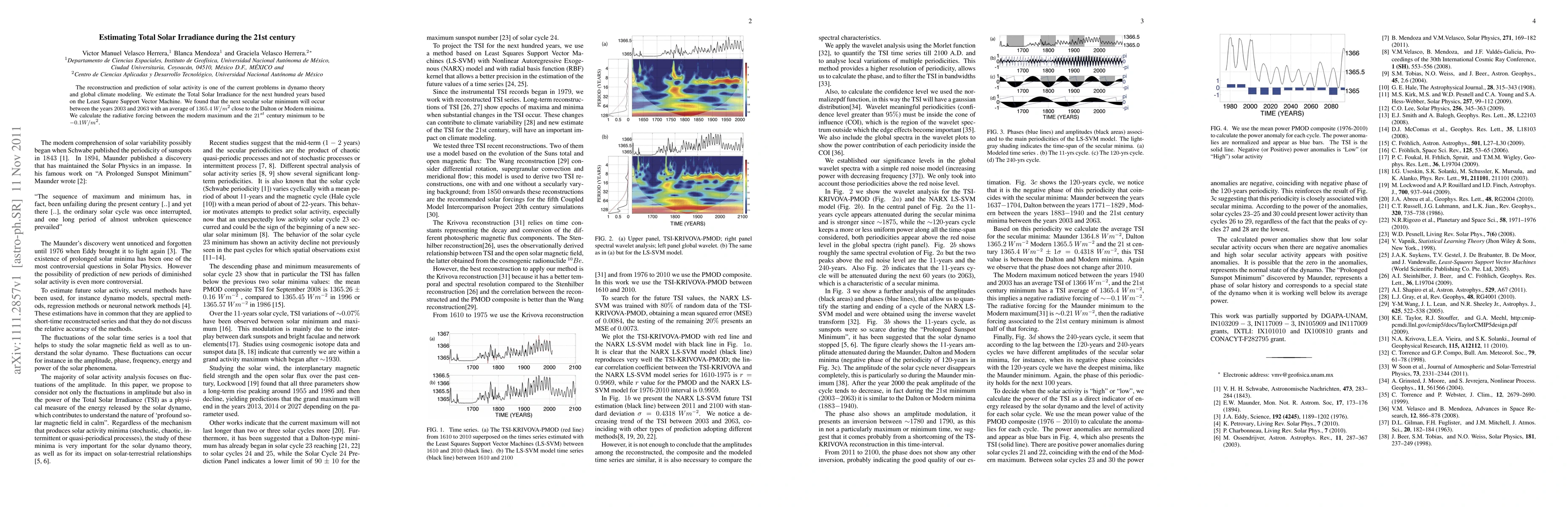 This research estimates Total Solar Irradiance for the 21st century using a Least Square Support Vector Machine, predicting a next secular minimum between 2003 and 2063 with an average of 1365.4W/m2. The radiative forcing difference between modern maximum and the century's minimum is calculated as -0.1W/m2.