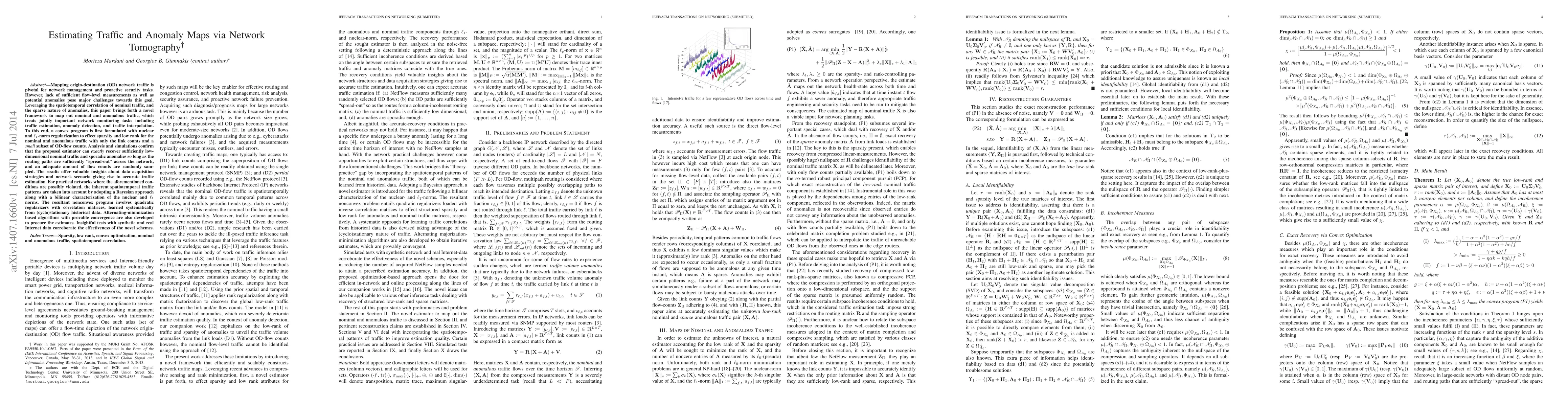 Mapping origin-destination (OD) network traffic is pivotal for network management and proactive security tasks. However, lack of sufficient flow-level measurements as well as potential anomalies pose major challenges towards this goal. Leveraging the spatiotemporal correlation of nominal traffic, and the sparse nature of anomalies, this paper brings forth a novel framework to map out nominal and anomalous traffic, which treats jointly important network monitoring tasks including traffic estimation, anomaly detection, and traffic interpolation. To this end, a convex program is first formulated with nuclear and $\ell_1$-norm regularization to effect sparsity and low rank for the nominal and anomalous traffic with only the link counts and a {\it small} subset of OD-flow counts. Analysis and simulations confirm that the proposed estimator can {\em exactly} recover sufficiently low-dimensional nominal traffic and sporadic anomalies so long as the routing paths are sufficiently "spread-out" across the network, and an adequate amount of flow counts are randomly sampled. The results offer valuable insights about data acquisition strategies and network scenaria giving rise to accurate traffic estimation. For practical networks where the aforementioned conditions are possibly violated, the inherent spatiotemporal traffic patterns are taken into account by adopting a Bayesian approach along with a bilinear characterization of the nuclear and $\ell_1$ norms. The resultant nonconvex program involves quadratic regularizers with correlation matrices, learned systematically from (cyclo)stationary historical data. Alternating-minimization based algorithms with provable convergence are also developed to procure the estimates. Insightful tests with synthetic and real Internet data corroborate the effectiveness of the novel schemes.