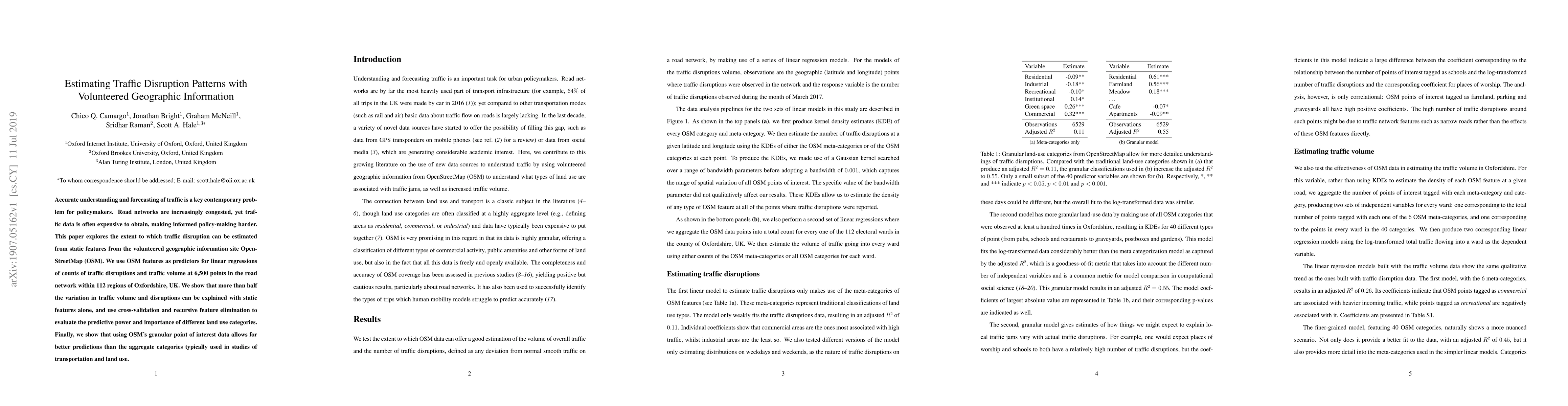 This paper investigates using OpenStreetMap (OSM) data to estimate traffic disruption patterns, demonstrating that static OSM features can explain over half the variation in traffic volume and disruptions. It finds that granular point of interest data from OSM provides better predictive power than aggregate land use categories.