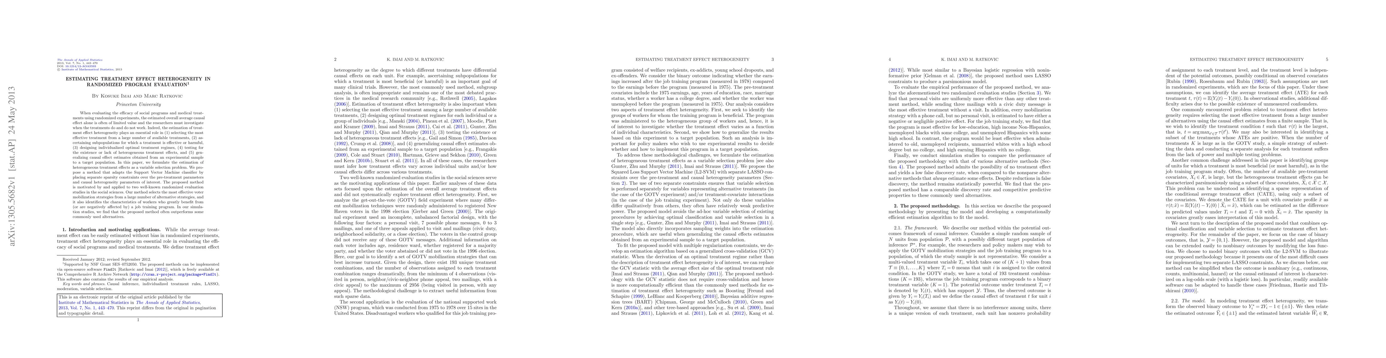 When evaluating the efficacy of social programs and medical treatments using randomized experiments, the estimated overall average causal effect alone is often of limited value and the researchers must investigate when the treatments do and do not work. Indeed, the estimation of treatment effect heterogeneity plays an essential role in (1) selecting the most effective treatment from a large number of available treatments, (2) ascertaining subpopulations for which a treatment is effective or harmful, (3) designing individualized optimal treatment regimes, (4) testing for the existence or lack of heterogeneous treatment effects, and (5) generalizing causal effect estimates obtained from an experimental sample to a target population. In this paper, we formulate the estimation of heterogeneous treatment effects as a variable selection problem. We propose a method that adapts the Support Vector Machine classifier by placing separate sparsity constraints over the pre-treatment parameters and causal heterogeneity parameters of interest. The proposed method is motivated by and applied to two well-known randomized evaluation studies in the social sciences. Our method selects the most effective voter mobilization strategies from a large number of alternative strategies, and it also identifies the characteristics of workers who greatly benefit from (or are negatively affected by) a job training program. In our simulation studies, we find that the proposed method often outperforms some commonly used alternatives.
