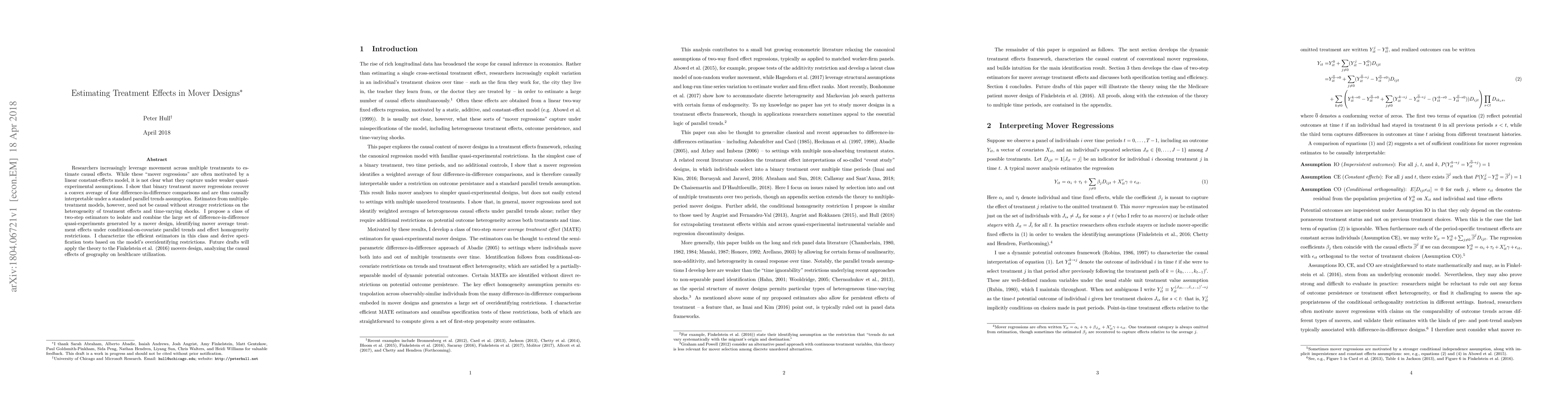 Researchers increasingly leverage movement across multiple treatments to estimate causal effects. While these "mover regressions" are often motivated by a linear constant-effects model, it is not clear what they capture under weaker quasi-experimental assumptions. I show that binary treatment mover regressions recover a convex average of four difference-in-difference comparisons and are thus causally interpretable under a standard parallel trends assumption. Estimates from multiple-treatment models, however, need not be causal without stronger restrictions on the heterogeneity of treatment effects and time-varying shocks. I propose a class of two-step estimators to isolate and combine the large set of difference-in-difference quasi-experiments generated by a mover design, identifying mover average treatment effects under conditional-on-covariate parallel trends and effect homogeneity restrictions. I characterize the efficient estimators in this class and derive specification tests based on the model's overidentifying restrictions. Future drafts will apply the theory to the Finkelstein et al. (2016) movers design, analyzing the causal effects of geography on healthcare utilization.