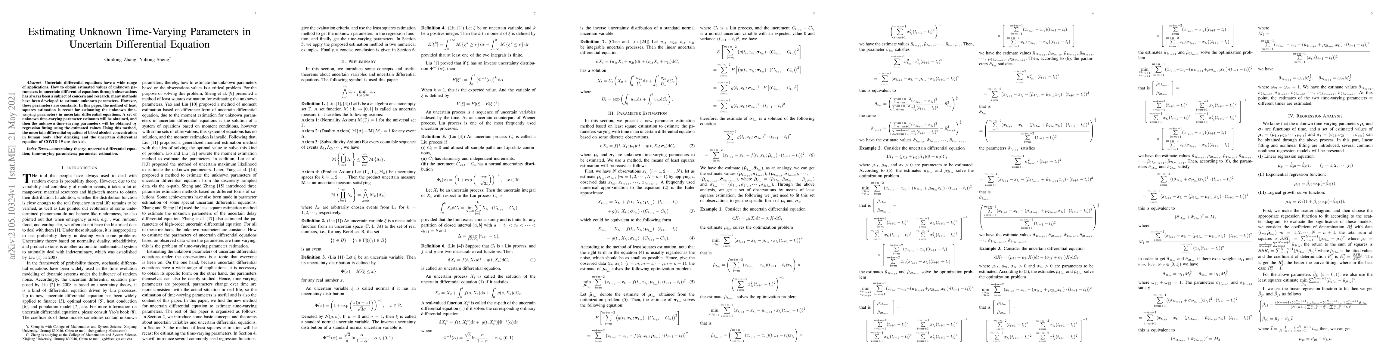 This paper proposes a method to estimate unknown time-varying parameters in uncertain differential equations using least squares estimation and regression fitting. It applies this approach to derive uncertain differential equations for blood alcohol concentration and COVID-19 modeling.