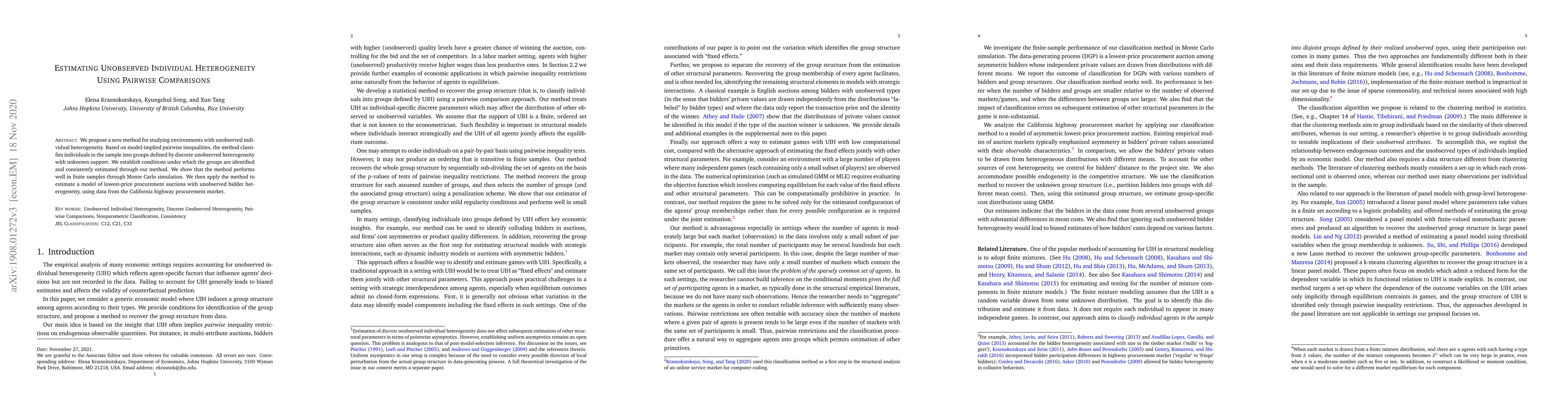 This paper introduces a novel method for classifying individuals with unobserved heterogeneity using pairwise comparisons, establishing conditions for consistent estimation and demonstrating its effectiveness via Monte Carlo simulations. The method is applied to estimate bidder heterogeneity in California's highway procurement auctions.