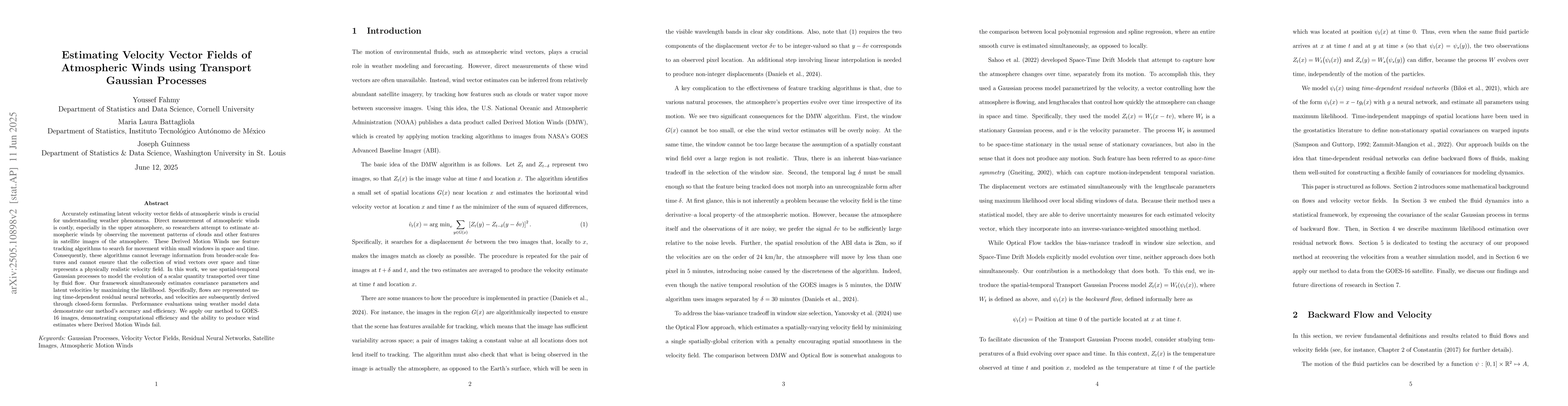 Researchers developed a new method to estimate atmospheric winds from satellite images, outperforming existing methods in accuracy and efficiency. The approach uses Gaussian processes to model wind patterns and derives velocities through closed-form formulas, enabling the creation of physically realistic velocity fields.