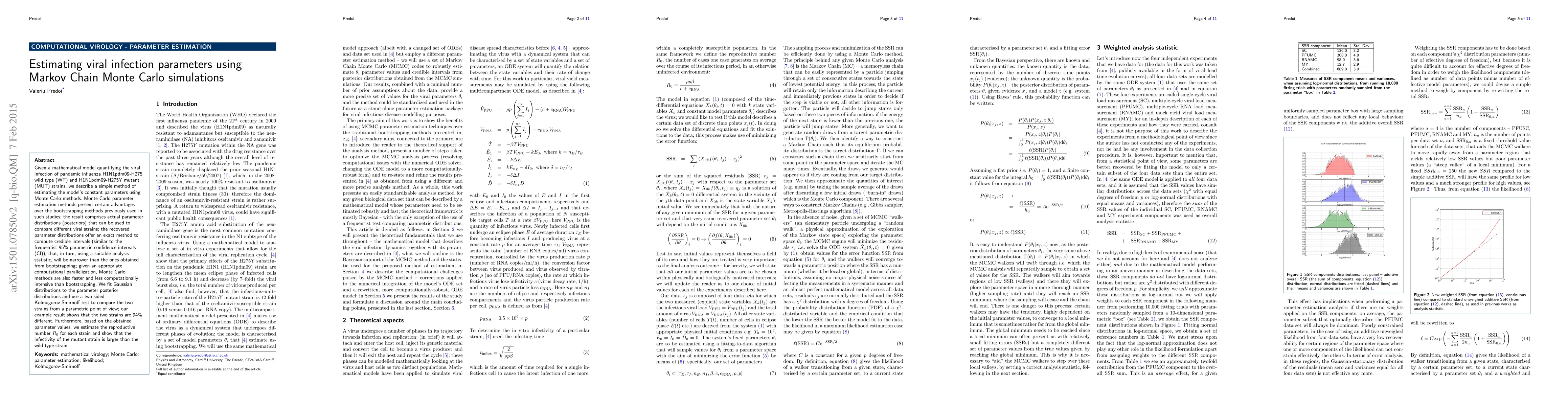 Given a mathematical model quantifying the viral infection of pandemic influenza H1N1pdm09-H275 wild type (WT) and H1N1pdm09-H275Y mutant (MUT) strains, we describe a simple method of estimating the model's constant parameters using Monte Carlo methods. Monte Carlo parameter estimation methods present certain advantages over the bootstrapping methods previously used in such studies: the result comprises actual parameter distributions (posteriors) that can be used to compare different viral strains; the recovered parameter distributions offer an exact method to compute credible intervals (similar to the frequentist 95% parametric confidence intervals (CI)), that, in turn, using a suitable analysis statistic, will be narrower than the ones obtained from bootstrapping; given an appropriate computational parallelization, Monte Carlo methods are also faster and less computationally intensive than bootstrapping. We fit Gaussian distributions to the parameter posterior distributions and use a two-sided Kolmogorov-Smirnoff test to compare the two strains from a parametric point of view; our example result shows that the two strains are 94% different. Furthermore, based on the obtained parameter values, we estimate the reproductive number R0 for each strain and show that the infectivity of the mutant strain is larger than the wild type strain.