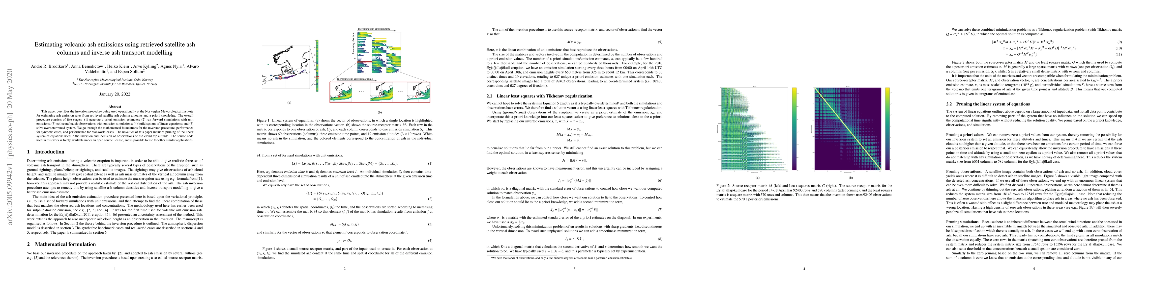 This paper outlines an operational inversion procedure at the Norwegian Meteorological Institute for estimating volcanic ash emissions using satellite data and inverse transport modelling. The method involves generating a priori estimates, running simulations, matching observations, building a system of equations, and solving it, with novel pruning techniques and altitude observations included.