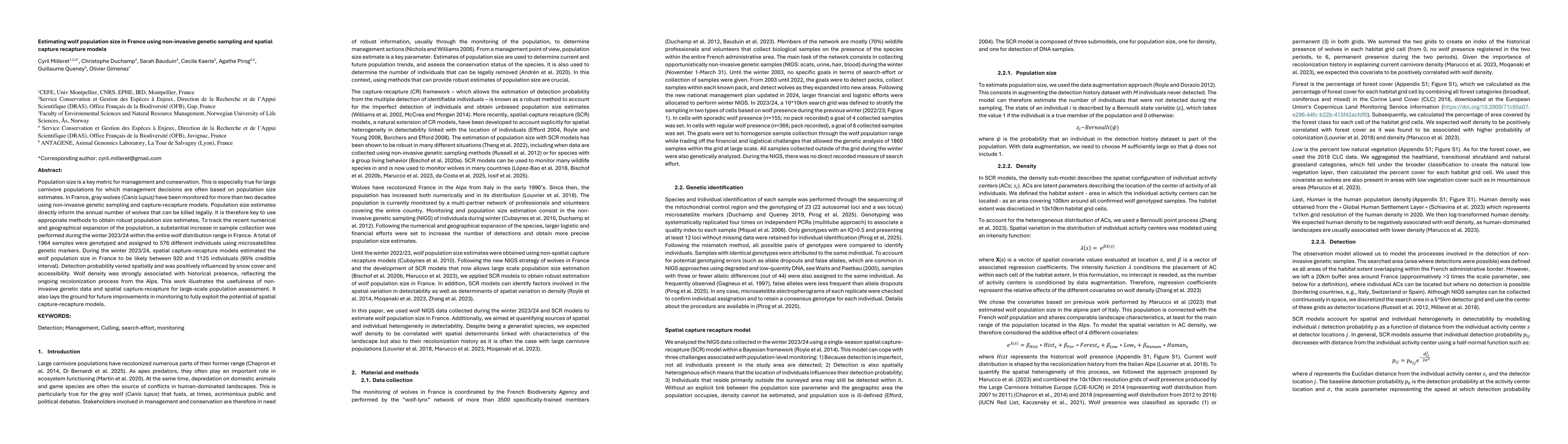 Population size is a key metric for management and conservation. This is especially true for large carnivore populations for which management decisions are often based on population size estimates. In France, gray wolves (Canis lupus) have been monitored for more than two decades using non-invasive genetic sampling and capture-recapture models. Population size estimates directly inform the annual number of wolves that can be killed legally. It is therefore key to use appropriate methods to obtain robust population size estimates. To track the recent numerical and geographical expansion of the population, a substantial increase in sample collection was performed during the winter 2023/24 within the entire wolf distribution range in France. A total of 1964 samples were genotyped and assigned to 576 different individuals using microsatellites genetic markers. During the winter 2023/24, spatial capture-recapture models estimated the wolf population size in France to be likely between 920 and 1125 individuals (95% credible interval). Detection probability varied spatially and was positively influenced by snow cover and accessibility. Wolf density was strongly associated with historical presence, reflecting the ongoing recolonization process from the Alps. This work illustrates the usefulness of non-invasive genetic data and spatial capture-recapture for large-scale population assessment. It also lays the ground for future improvements in monitoring to fully exploit the potential of spatial capture-recapture models.