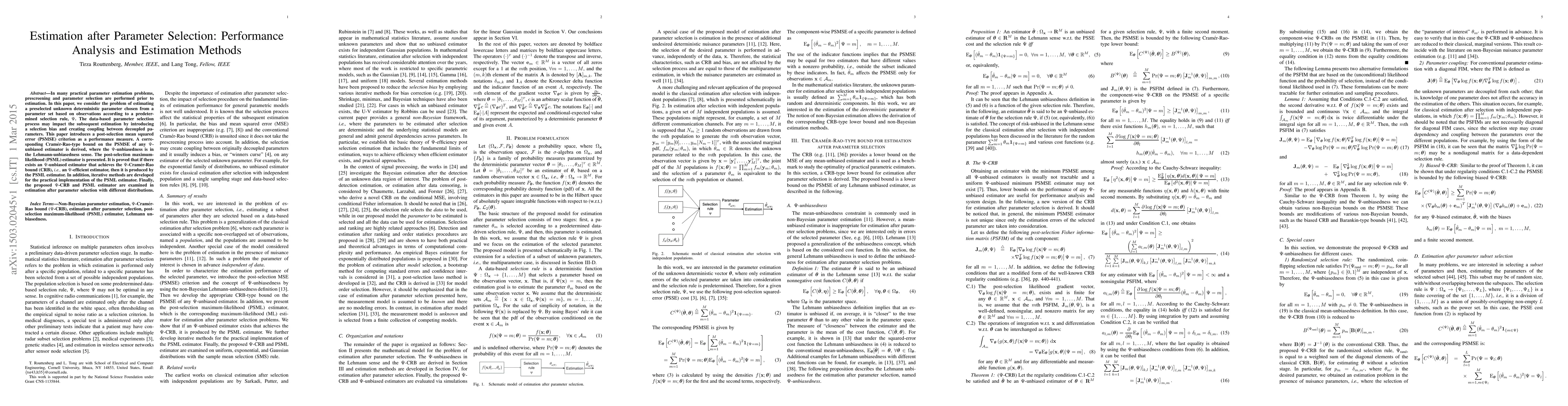 This paper investigates the impact of data-based parameter selection on estimation, introducing a post-selection mean squared error (PSMSE) criterion and a Cramér-Rao-type bound for $\Psi$-unbiased estimators. It proposes the post-selection maximum-likelihood (PSML) estimator, proving its efficiency and developing iterative methods for practical implementation.