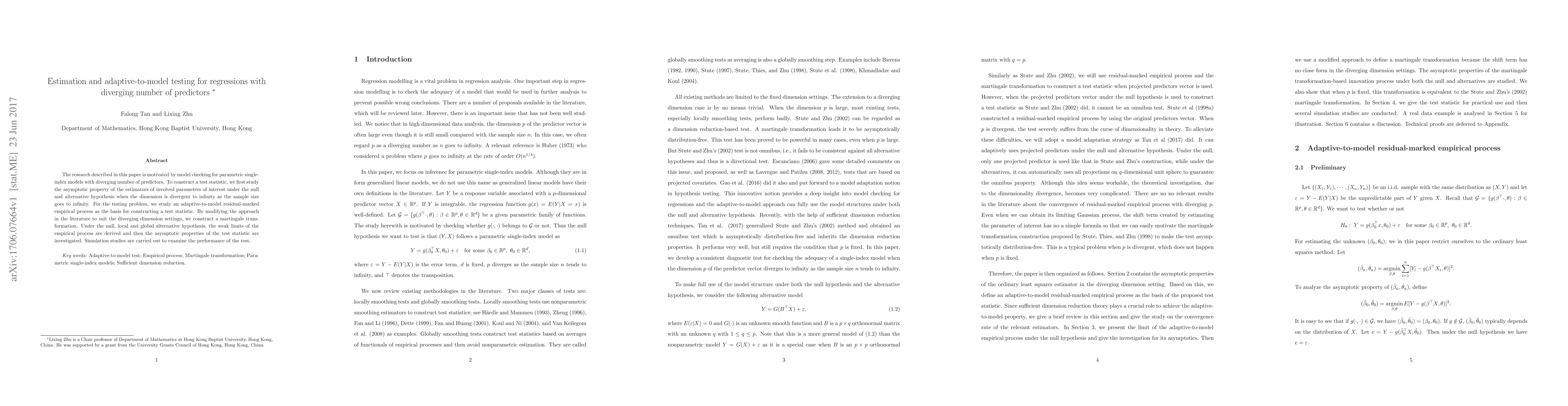 This paper develops an adaptive-to-model test for regressions with a diverging number of predictors, focusing on parametric single-index models. It constructs a test statistic based on an adaptive residual-marked empirical process and investigates its asymptotic properties under various hypotheses. Simulation studies assess the test's performance.