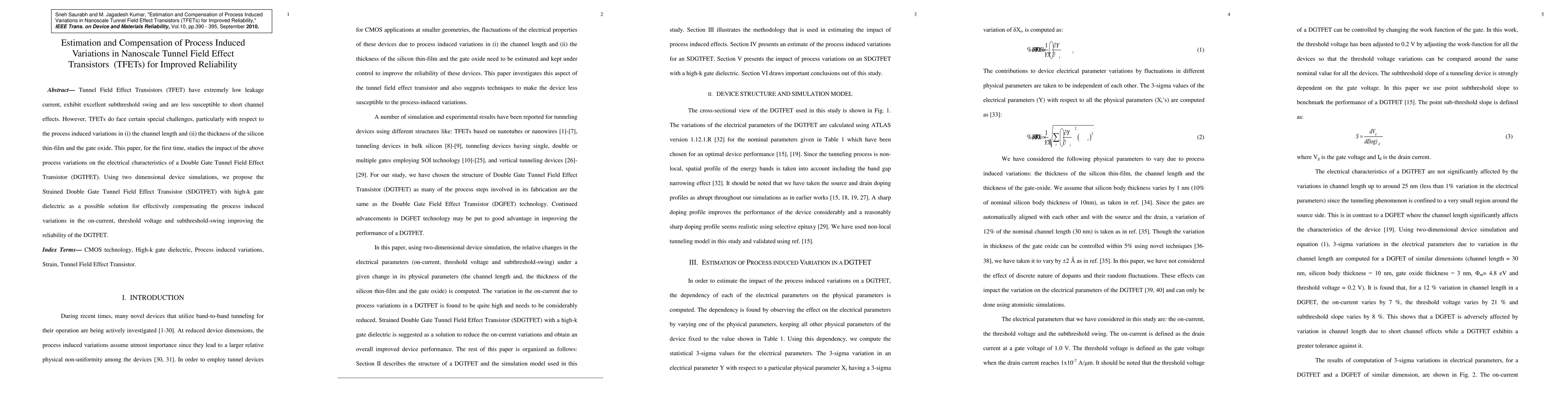This paper investigates the process-induced variations in Double Gate Tunnel Field Effect Transistors (DGTFETs) and proposes a Strained Double Gate Tunnel Field Effect Transistor (SDGTFET) with high-k gate dielectrics to compensate for these variations, thereby improving the reliability of nanoscale TFETs. Simulation results demonstrate the effectiveness of the proposed SDGTFET in enhancing on-current, threshold voltage, and subthreshold swing.