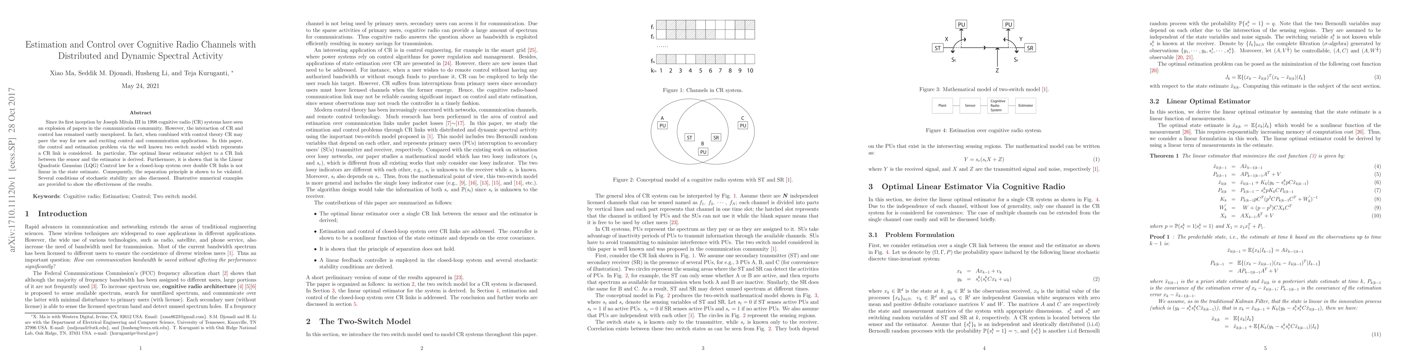 This paper explores the control and estimation problem in cognitive radio systems, deriving an optimal linear estimator with a CR link between sensor and estimator. It also discusses conditions for stochastic stability and shows that traditional LQG control laws may not be effective over double CR links.