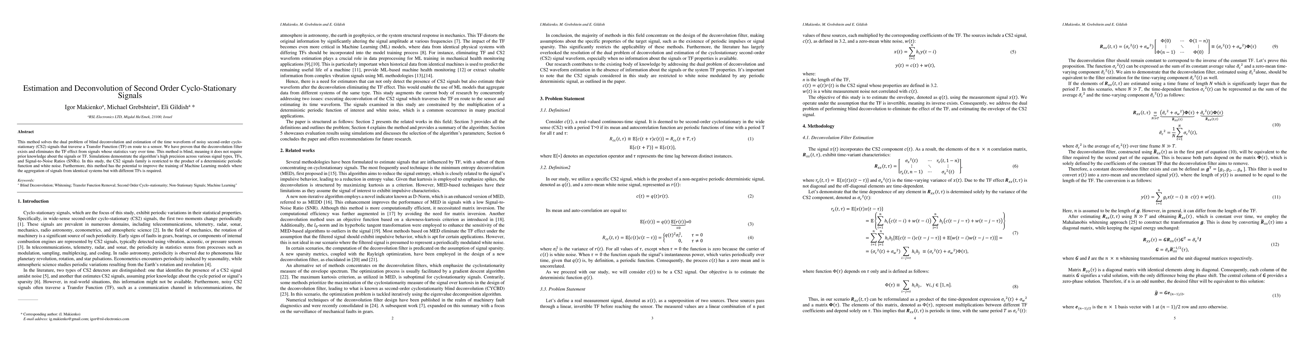 This paper proposes a blind algorithm for estimating and deconvolving noisy second-order cyclostationary signals traversing a Transfer Function, proving the existence of a deconvolution filter. The method demonstrates high precision across diverse signal types and SNRs without requiring prior knowledge of the signals or TFs.