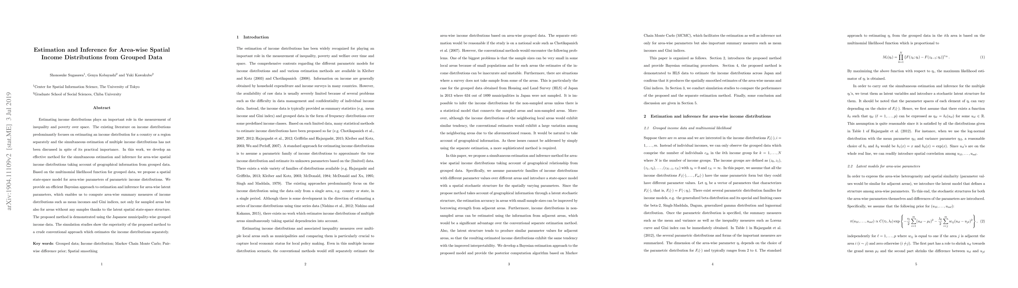 This paper develops a Bayesian spatial state-space model to simultaneously estimate and infer area-wise income distributions from grouped data, enabling computation of summary measures like mean incomes and Gini indices even for areas without samples, demonstrated using Japanese municipality data. Simulation results show the method's superiority over separate income distribution estimation.
