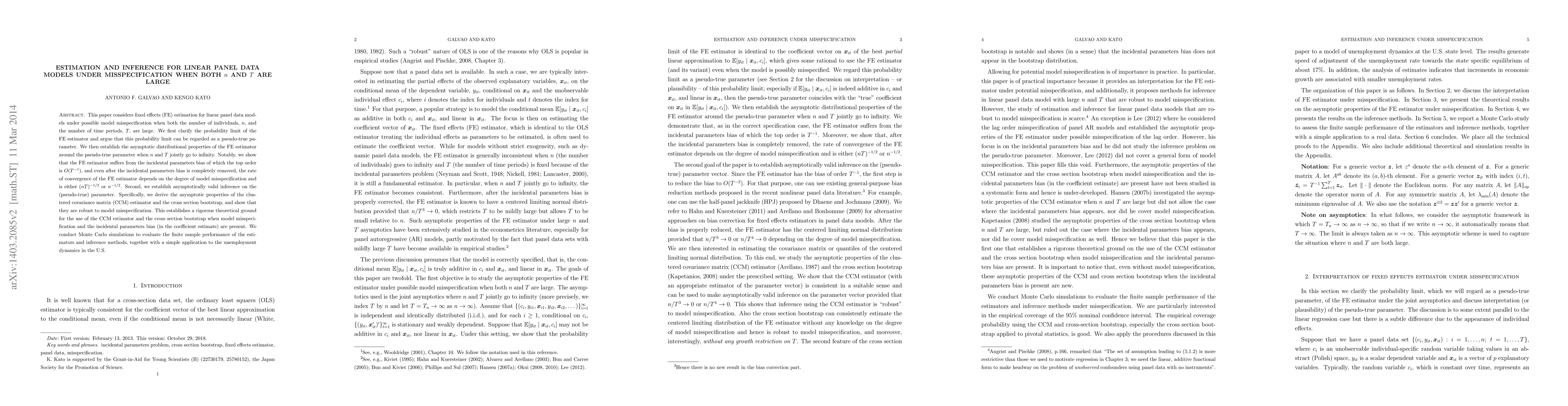 This paper investigates fixed effects estimation for linear panel data models under model misspecification when both the number of individuals and time periods are large. It establishes the asymptotic distribution of the fixed effects estimator, showing it suffers from incidental parameters bias, and proposes robust inference methods like the clustered covariance matrix estimator and cross section bootstrap.