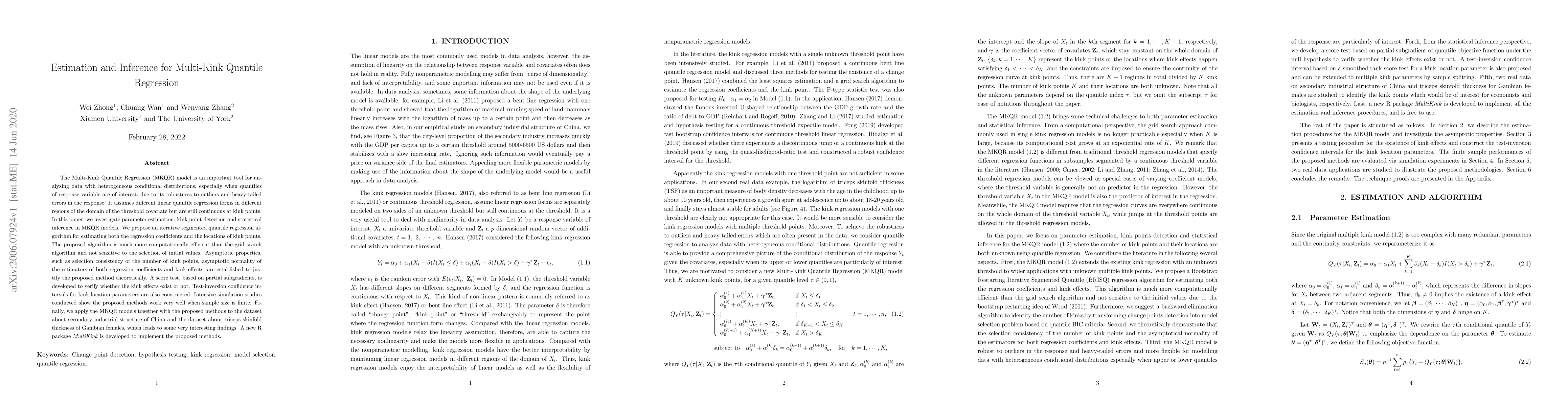 The Multi-Kink Quantile Regression (MKQR) model is an important tool for analyzing data with heterogeneous conditional distributions, especially when quantiles of response variable are of interest, due to its robustness to outliers and heavy-tailed errors in the response. It assumes different linear quantile regression forms in different regions of the domain of the threshold covariate but are still continuous at kink points. In this paper, we investigate parameter estimation, kink point detection and statistical inference in MKQR models. We propose an iterative segmented quantile regression algorithm for estimating both the regression coefficients and the locations of kink points. The proposed algorithm is much more computationally efficient than the grid search algorithm and not sensitive to the selection of initial values. Asymptotic properties, such as selection consistency of the number of kink points, asymptotic normality of the estimators of both regression coefficients and kink effects, are established to justify the proposed method theoretically. A score test, based on partial subgradients, is developed to verify whether the kink effects exist or not. Test-inversion confidence intervals for kink location parameters are also constructed. Intensive simulation studies conducted show the proposed methods work very well when sample size is finite. Finally, we apply the MKQR models together with the proposed methods to the dataset about secondary industrial structure of China and the dataset about triceps skinfold thickness of Gambian females, which leads to some very interesting findings. A new R package MultiKink is developed to implement the proposed methods.