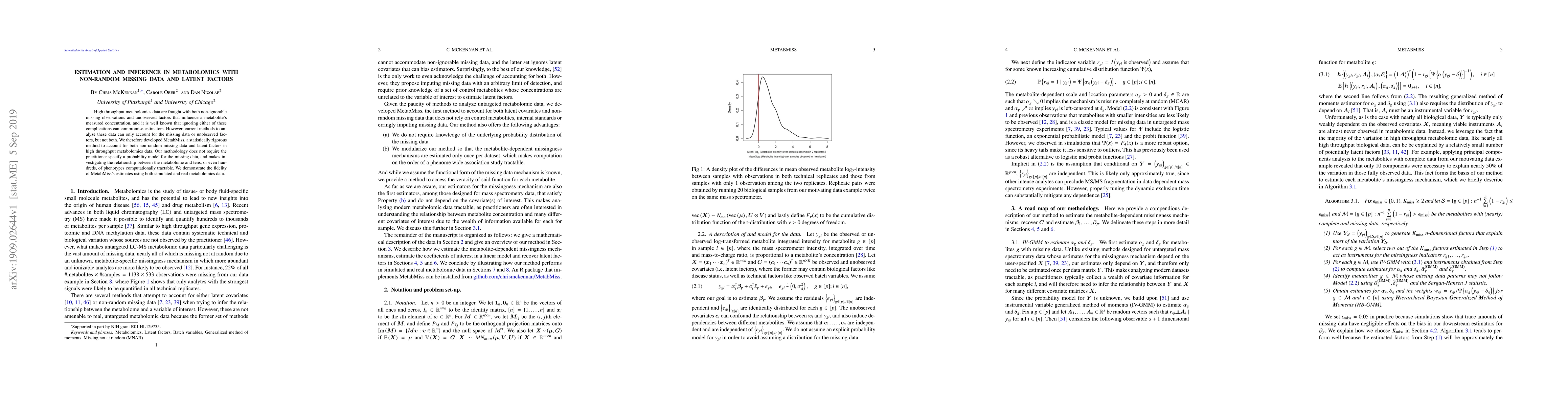 This paper introduces MetabMiss, a novel method for analyzing high throughput metabolomics data that accounts for both non-random missing observations and latent factors influencing metabolite concentrations. Unlike existing methods, MetabMiss does not require specifying a probability model for missing data and enables the investigation of relationships between the metabolome and numerous phenotypes efficiently.