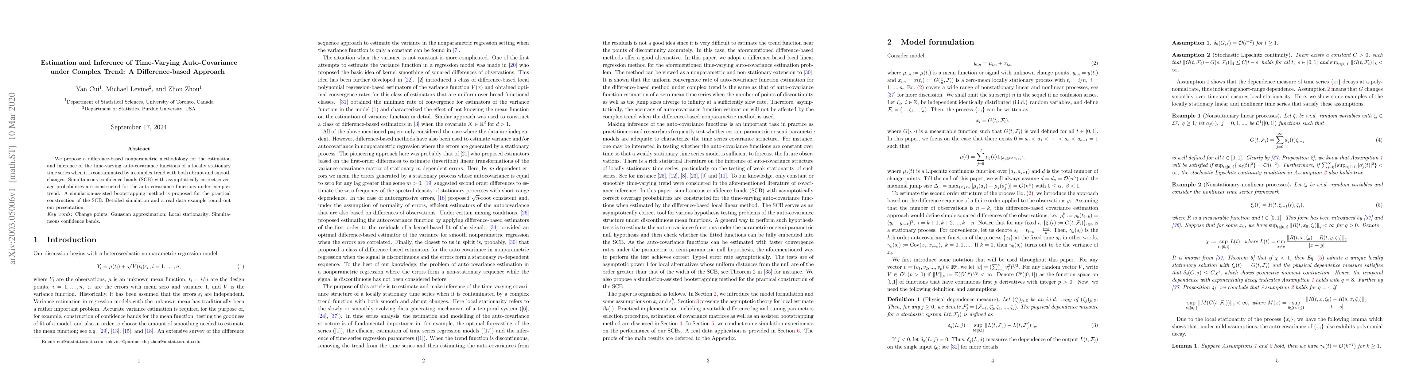 This paper introduces a difference-based nonparametric method for estimating and inferring time-varying auto-covariance functions in locally stationary time series with complex trends. It constructs simultaneous confidence bands with asymptotically correct coverage probabilities and employs a simulation-assisted bootstrapping technique for practical implementation.