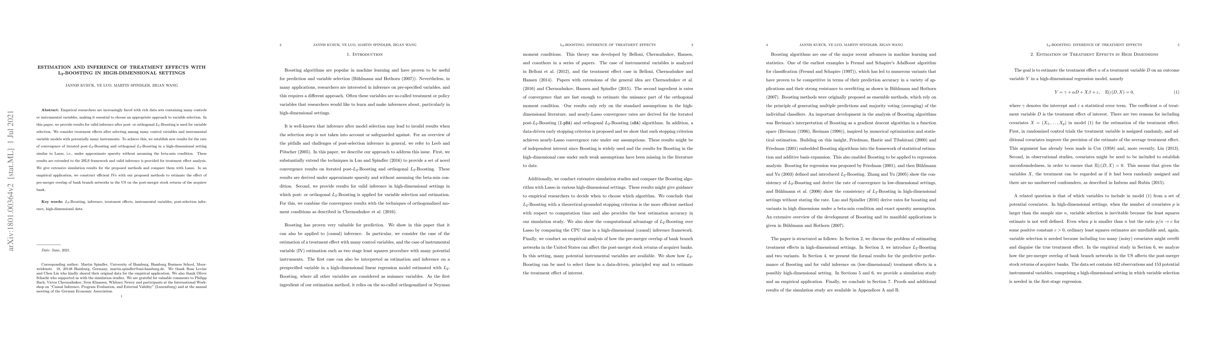 This paper develops methods for estimating and inferring treatment effects using $L_2$-Boosting in high-dimensional settings, providing valid inference after variable selection. It establishes convergence rates for iterated post-$L_2$-Boosting and extends these results to the 2SLS framework, demonstrating their effectiveness through simulations and an empirical application on bank merger stock returns.