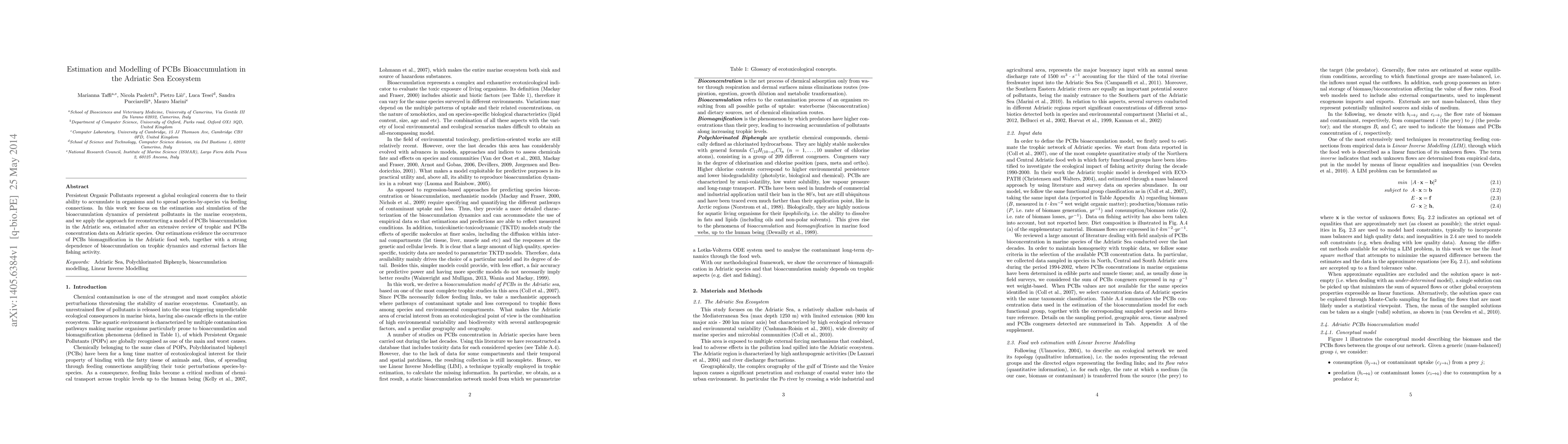 This paper estimates and models the bioaccumulation dynamics of PCBs in the Adriatic Sea ecosystem, revealing PCBs biomagnification and highlighting the influence of trophic interactions and fishing activity on bioaccumulation levels.