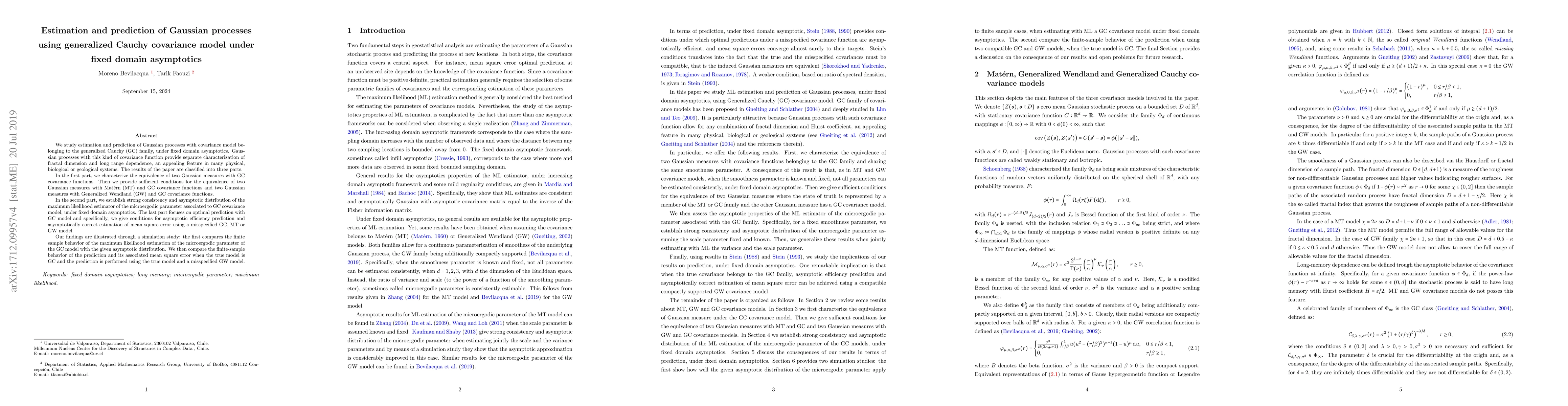 This paper investigates the estimation and prediction of Gaussian processes with generalized Cauchy covariance functions under fixed domain asymptotics. It provides conditions for equivalence between Gaussian measures, consistency of maximum likelihood estimators, and optimal prediction efficiency, illustrated through simulations.