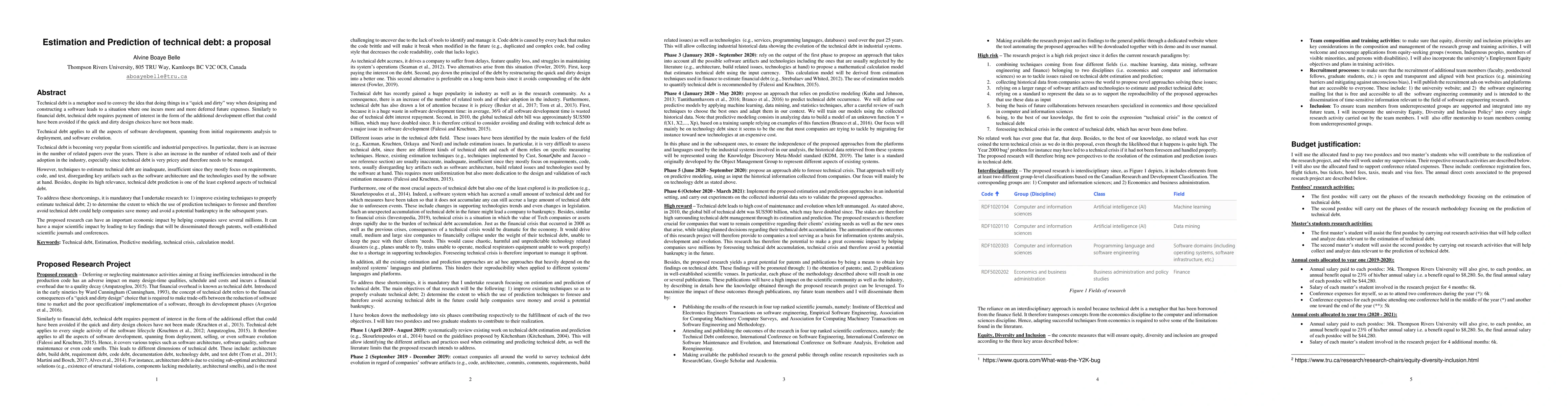 Technical debt is a metaphor used to convey the idea that doing things in a "quick and dirty" way when designing and constructing a software leads to a situation where one incurs more and more deferred future expenses. Similarly to financial debt, technical debt requires payment of interest in the form of the additional development effort that could have been avoided if the quick and dirty design choices have not been made. Technical debt applies to all the aspects of software development, spanning from initial requirements analysis to deployment, and software evolution. Technical debt is becoming very popular from scientific and industrial perspectives. In particular, there is an increase in the number of related papers over the years. There is also an increase in the number of related tools and of their adoption in the industry, especially since technical debt is very pricey and therefore needs to be managed. However, techniques to estimate technical debt are inadequate, insufficient since they mostly focus on requirements, code, and test, disregarding key artifacts such as the software architecture and the technologies used by the software at hand. Besides, despite its high relevance, technical debt prediction is one of the least explored aspects of technical debt. To address these shortcomings, it is mandatory that I undertake research to: 1) improve existing techniques to properly estimate technical debt; 2) to determine the extent to which the use of prediction techniques to foresee and therefore avoid technical debt could help companies save money and avoid a potential bankruptcy in the subsequent years. The proposed research can have an important economic impact by helping companies save several millions. It can have a major scientific impact by leading to key findings that will be disseminated through patents, well-established scientific journals and conferences.