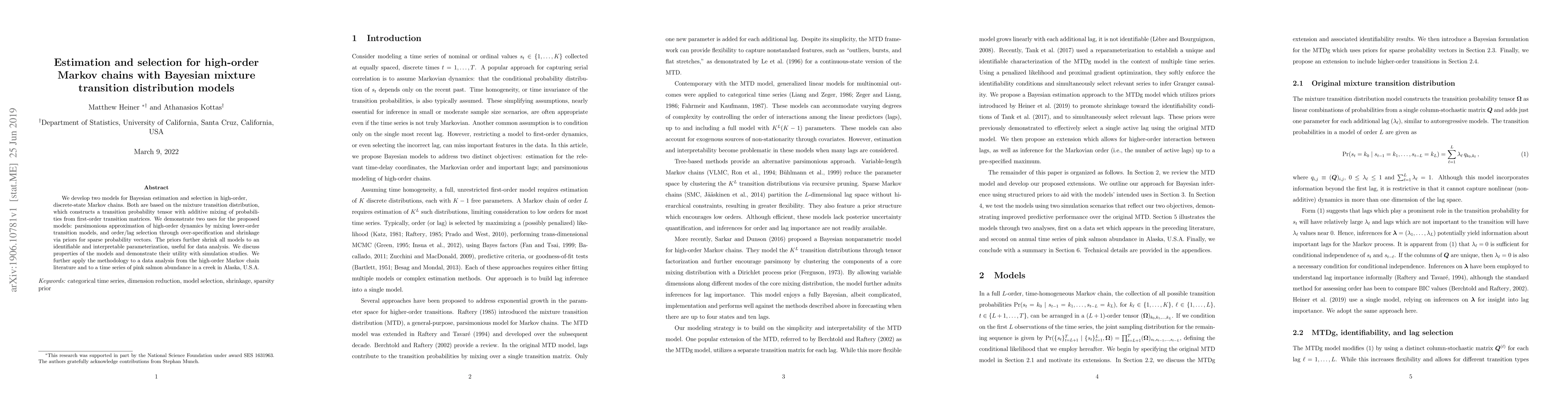 This paper proposes two Bayesian mixture transition distribution models for estimating and selecting high-order Markov chains. The models facilitate parsimonious approximation and order/lag selection through shrinkage priors, demonstrating utility via simulations and real-world data analysis.