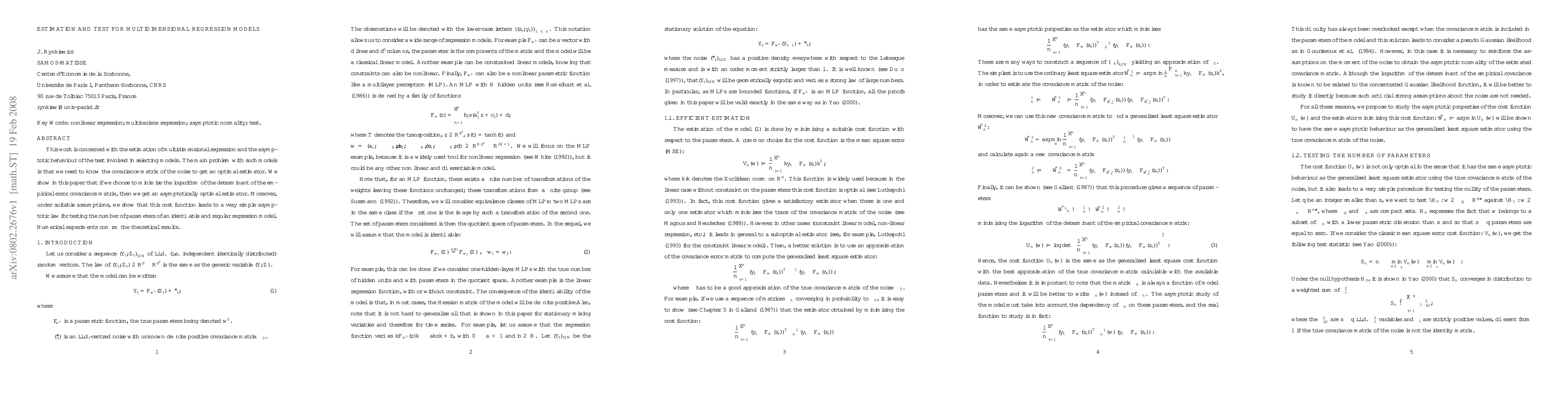 This work is concerned with the estimation of multidimensional regression and the asymptotic behaviour of the test involved in selecting models. The main problem with such models is that we need to know the covariance matrix of the noise to get an optimal estimator. We show in this paper that if we choose to minimise the logarithm of the determinant of the empirical error covariance matrix, then we get an asymptotically optimal estimator. Moreover, under suitable assumptions, we show that this cost function leads to a very simple asymptotic law for testing the number of parameters of an identifiable and regular regression model. Numerical experiments confirm the theoretical results.