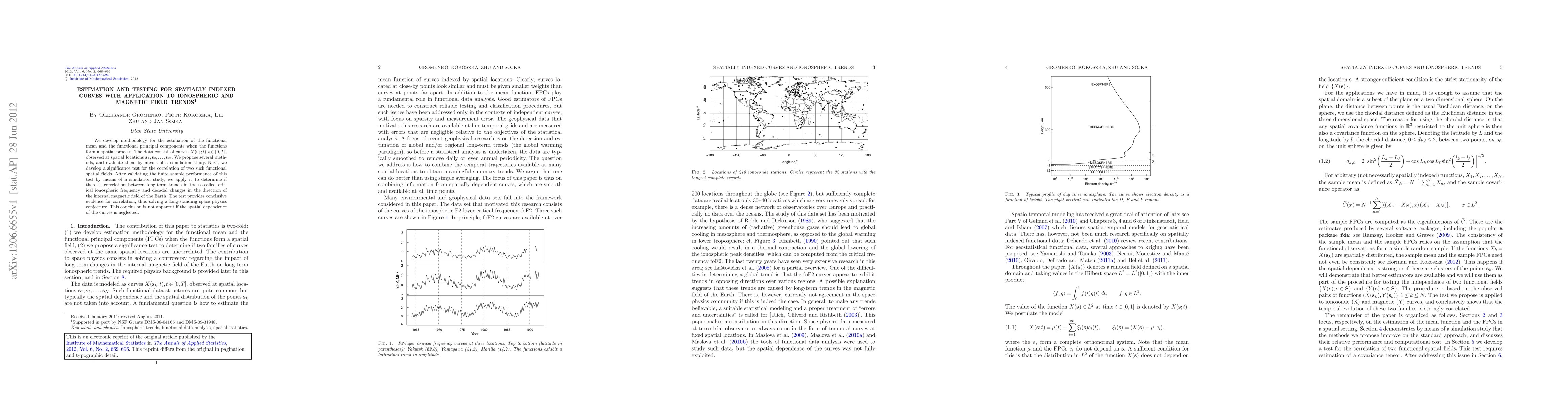 This paper introduces methods to estimate functional mean and principal components for spatial processes of curves, validated through simulations. It also presents a test for correlation between two such fields, applied to ionospheric and magnetic field trends, revealing a correlation supporting a long-standing space physics conjecture.