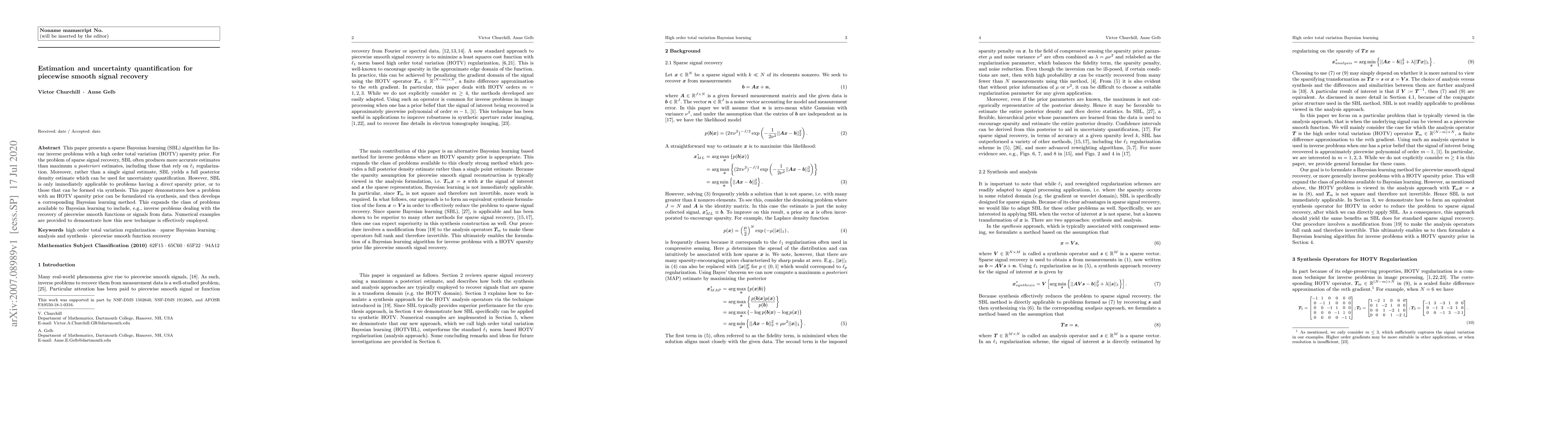 This paper introduces a sparse Bayesian learning algorithm for linear inverse problems using a high-order total variation sparsity prior, providing more accurate estimates than l1 regularization methods. It extends Bayesian learning to inverse problems involving the recovery of piecewise smooth signals, offering full posterior density estimates for uncertainty quantification.