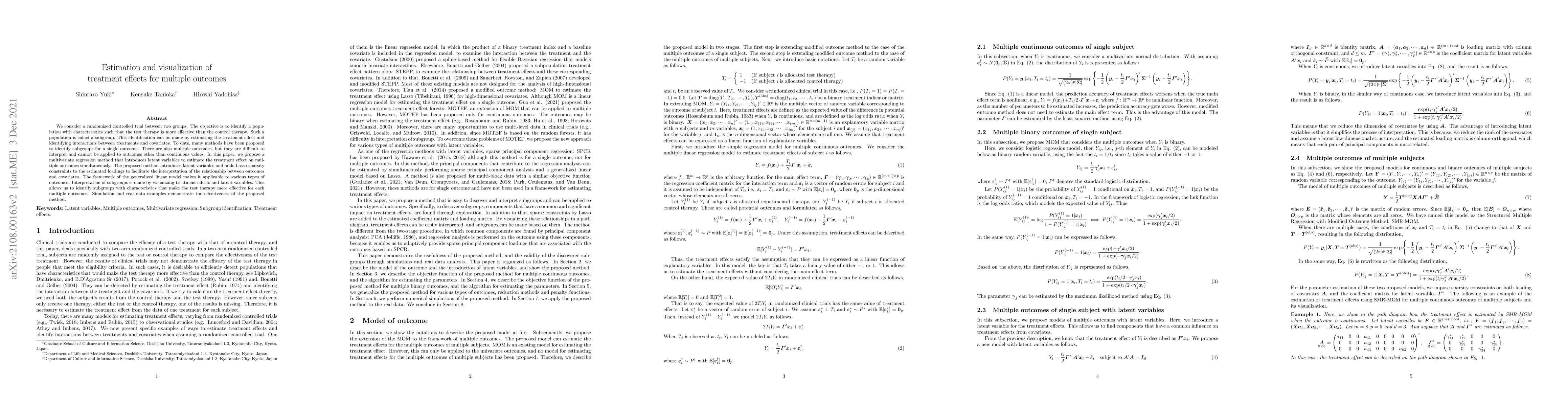 This paper proposes a multivariate regression method with latent variables and Lasso constraints to estimate and visualize treatment effects for multiple outcomes in a randomized controlled trial. The method facilitates interpretation and identification of subgroups where the test therapy is more effective, applicable to various outcome types.
