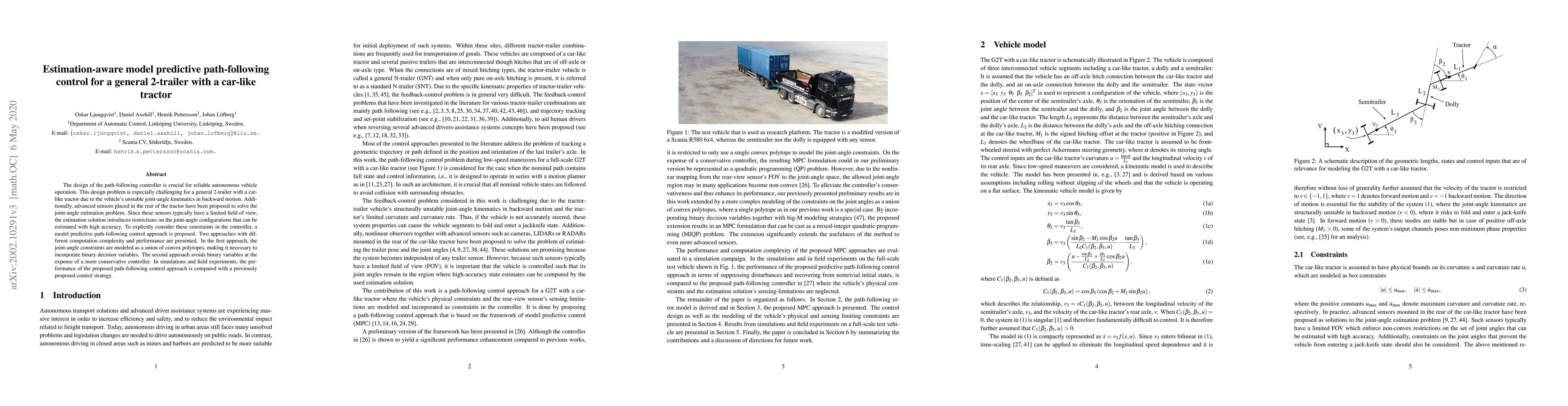 This paper proposes a model predictive path-following control for a 2-trailer with a car-like tractor, addressing the vehicle's unstable joint-angle kinematics. It introduces two control approaches, one with binary decision variables and another more conservative, both considering joint-angle estimation constraints from rear-mounted sensors.