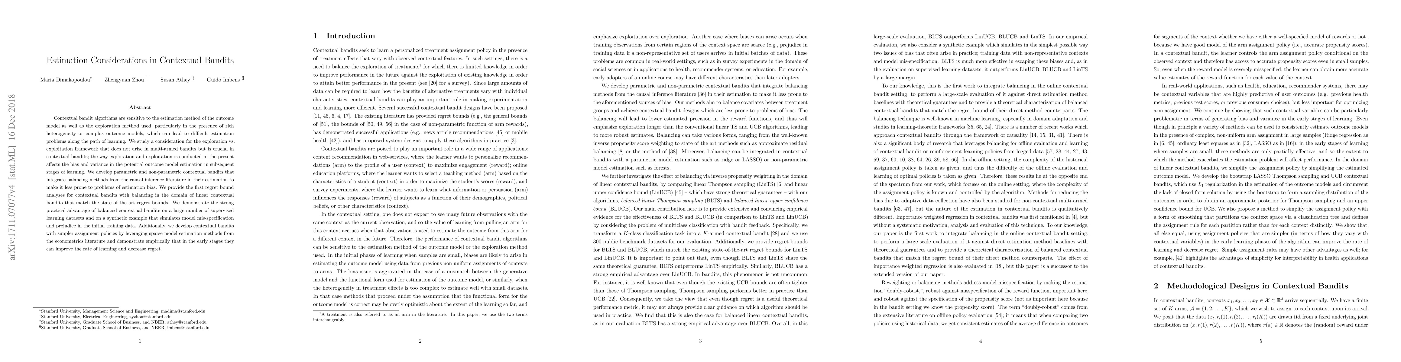 Contextual bandit algorithms are sensitive to the estimation method of the outcome model as well as the exploration method used, particularly in the presence of rich heterogeneity or complex outcome models, which can lead to difficult estimation problems along the path of learning. We study a consideration for the exploration vs. exploitation framework that does not arise in multi-armed bandits but is crucial in contextual bandits; the way exploration and exploitation is conducted in the present affects the bias and variance in the potential outcome model estimation in subsequent stages of learning. We develop parametric and non-parametric contextual bandits that integrate balancing methods from the causal inference literature in their estimation to make it less prone to problems of estimation bias. We provide the first regret bound analyses for contextual bandits with balancing in the domain of linear contextual bandits that match the state of the art regret bounds. We demonstrate the strong practical advantage of balanced contextual bandits on a large number of supervised learning datasets and on a synthetic example that simulates model mis-specification and prejudice in the initial training data. Additionally, we develop contextual bandits with simpler assignment policies by leveraging sparse model estimation methods from the econometrics literature and demonstrate empirically that in the early stages they can improve the rate of learning and decrease regret.