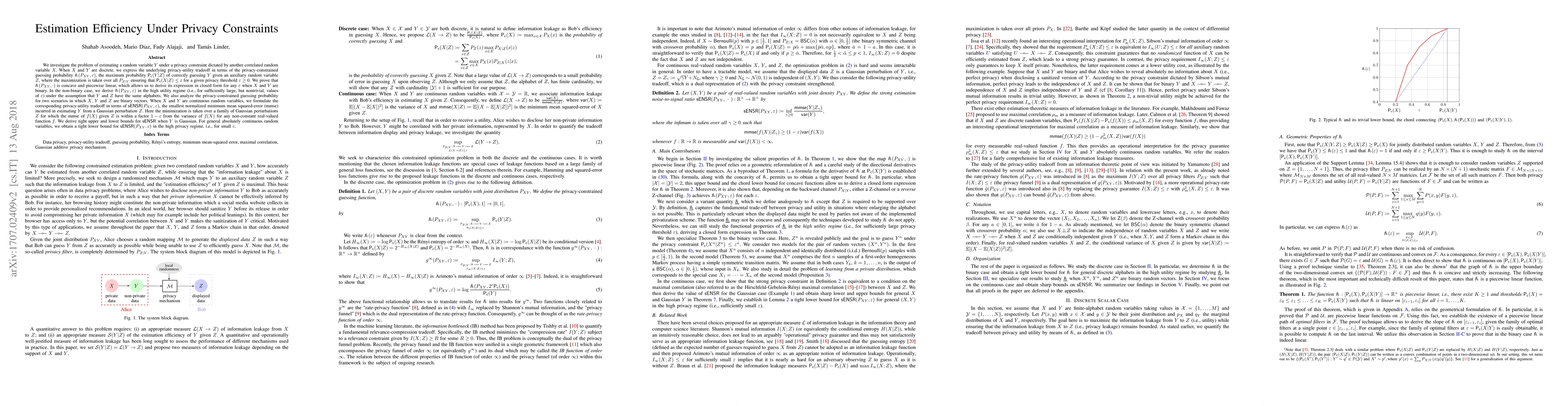 We investigate the problem of estimating a random variable $Y\in \mathcal{Y}$ under a privacy constraint dictated by another random variable $X\in \mathcal{X}$, where estimation efficiency and privacy are assessed in terms of two different loss functions. In the discrete case, we use the Hamming loss function and express the corresponding utility-privacy tradeoff in terms of the privacy-constrained guessing probability $h(P_{XY}, \epsilon)$, the maximum probability $\mathsf{P}_\mathsf{c}(Y|Z)$ of correctly guessing $Y$ given an auxiliary random variable $Z\in \mathcal{Z}$, where the maximization is taken over all $P_{Z|Y}$ ensuring that $\mathsf{P}_\mathsf{c}(X|Z)\leq \epsilon$ for a given privacy threshold $\epsilon \geq 0$. We prove that $h(P_{XY}, \cdot)$ is concave and piecewise linear, which allows us to derive its expression in closed form for any $\epsilon$ when $X$ and $Y$ are binary. In the non-binary case, we derive $h(P_{XY}, \epsilon)$ in the high utility regime (i.e., for sufficiently large values of $\epsilon$) under the assumption that $Z$ takes values in $\mathcal{Y}$. We also analyze the privacy-constrained guessing probability for two binary vector scenarios. When $X$ and $Y$ are continuous random variables, we use the squared-error loss function and express the corresponding utility-privacy tradeoff in terms of $\mathsf{sENSR}(P_{XY}, \epsilon)$, which is the smallest normalized minimum mean squared-error (mmse) incurred in estimating $Y$ from its Gaussian perturbation $Z$, such that the mmse of $f(X)$ given $Z$ is within $\epsilon$ of the variance of $f(X)$ for any non-constant real-valued function $f$. We derive tight upper and lower bounds for $\mathsf{sENSR}$ when $Y$ is Gaussian. We also obtain a tight lower bound for $\mathsf{sENSR}(P_{XY}, \epsilon)$ for general absolutely continuous random variables when $\epsilon$ is sufficiently small.