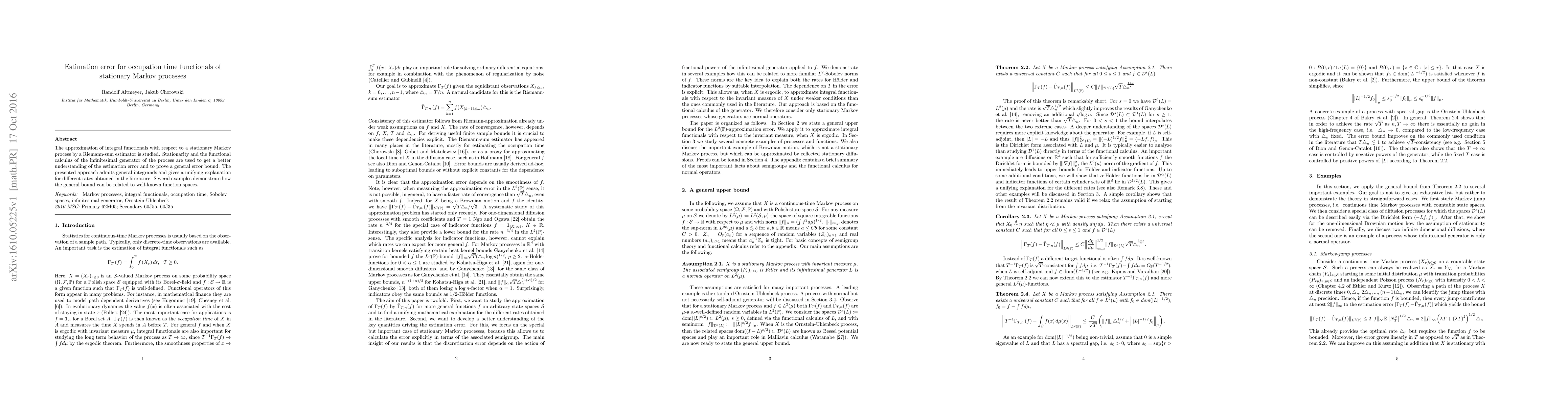 The approximation of integral functionals with respect to a stationary Markov process by a Riemann-sum estimator is studied. Stationarity and the functional calculus of the infinitesimal generator of the process are used to get a better understanding of the estimation error and to prove a general error bound. The presented approach admits general integrands and gives a unifying explanation for different rates obtained in the literature. Several examples demonstrate how the general bound can be related to well-known function spaces.