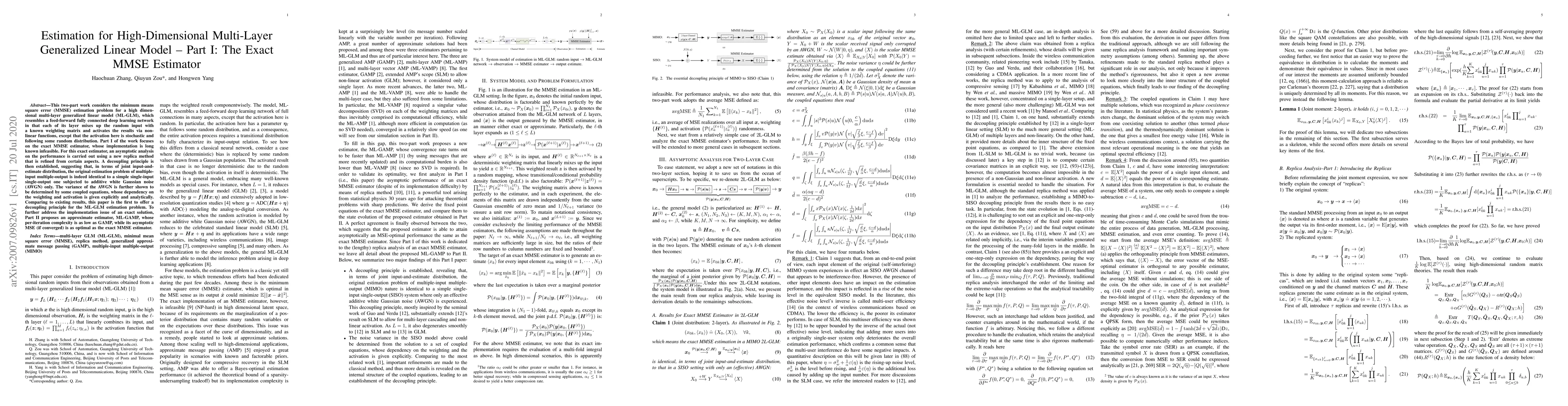 This two-part work considers the minimum means square error (MMSE) estimation problem for a high dimensional multi-layer generalized linear model (ML-GLM), which resembles a feed-forward fully connected deep learning network in that each of its layer mixes up the random input with a known weighting matrix and activates the results via non-linear functions, except that the activation here is stochastic and following some random distribution. Part I of the work focuses on the exact MMSE estimator, whose implementation is long known infeasible. For this exact estimator, an asymptotic analysis on the performance is carried out using a new replica method that is refined from certain aspects. A decoupling principle is then established, suggesting that, in terms of joint input-and-estimate distribution, the original estimation problem of multiple-input multiple-output is indeed identical to a simple single-input single-output one subjected to additive white Gaussian noise (AWGN) only. The variance of the AWGN is further shown to be determined by some coupled equations, whose dependency on the weighting and activation is given explicitly and analytically. Comparing to existing results, this paper is the first to offer a decoupling principle for the ML-GLM estimation problem. To further address the implementation issue of an exact solution, Part II proposes an approximate estimator, ML-GAMP, whose per-iteration complexity is as low as GAMP, while its asymptotic MSE (if converged) is as optimal as the exact MMSE estimator.