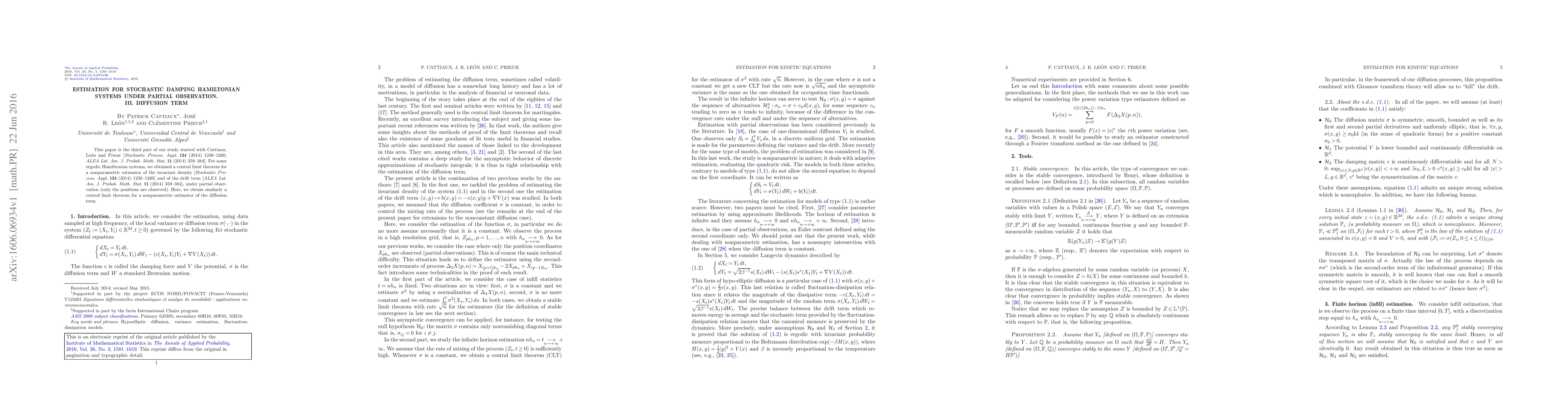 This paper is the third part of our study started with Cattiaux, Le\'{o}n and Prieur [Stochastic Process. Appl. 124 (2014) 1236-1260; ALEA Lat. Am. J. Probab. Math. Stat. 11 (2014) 359-384]. For some ergodic Hamiltonian systems, we obtained a central limit theorem for a nonparametric estimator of the invariant density [Stochastic Process. Appl. 124 (2014) 1236-1260] and of the drift term [ALEA Lat. Am. J. Probab. Math. Stat. 11 (2014) 359-384], under partial observation (only the positions are observed). Here, we obtain similarly a central limit theorem for a nonparametric estimator of the diffusion term.