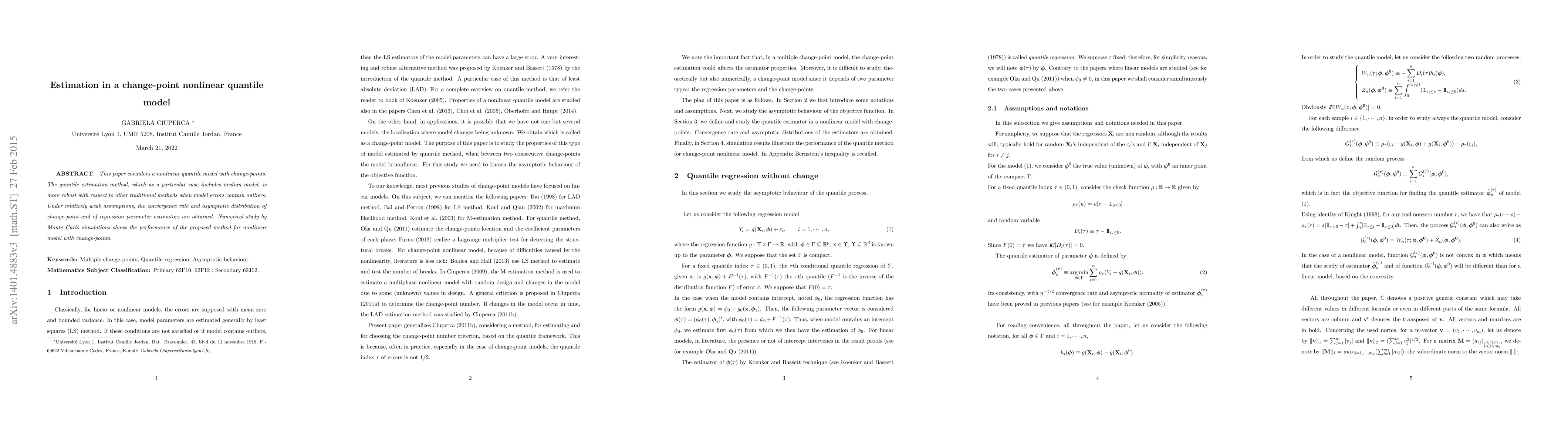 The paper presents theoretical results on the convergence rate and asymptotic distribution of estimators in a change-point nonlinear quantile model.
