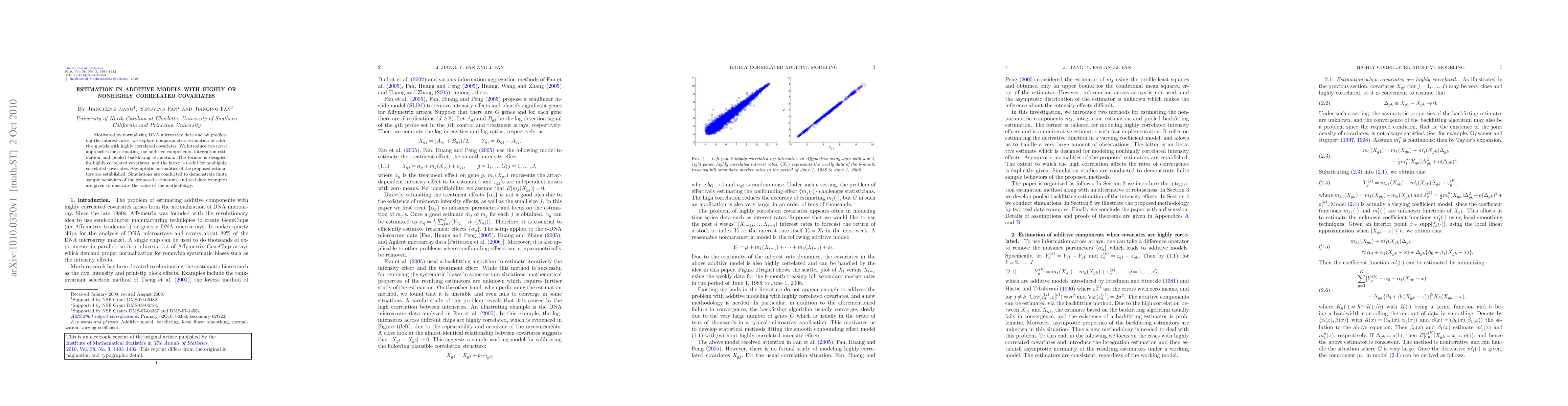 Motivated by normalizing DNA microarray data and by predicting the interest rates, we explore nonparametric estimation of additive models with highly correlated covariates. We introduce two novel approaches for estimating the additive components, integration estimation and pooled backfitting estimation. The former is designed for highly correlated covariates, and the latter is useful for nonhighly correlated covariates. Asymptotic normalities of the proposed estimators are established. Simulations are conducted to demonstrate finite sample behaviors of the proposed estimators, and real data examples are given to illustrate the value of the methodology.