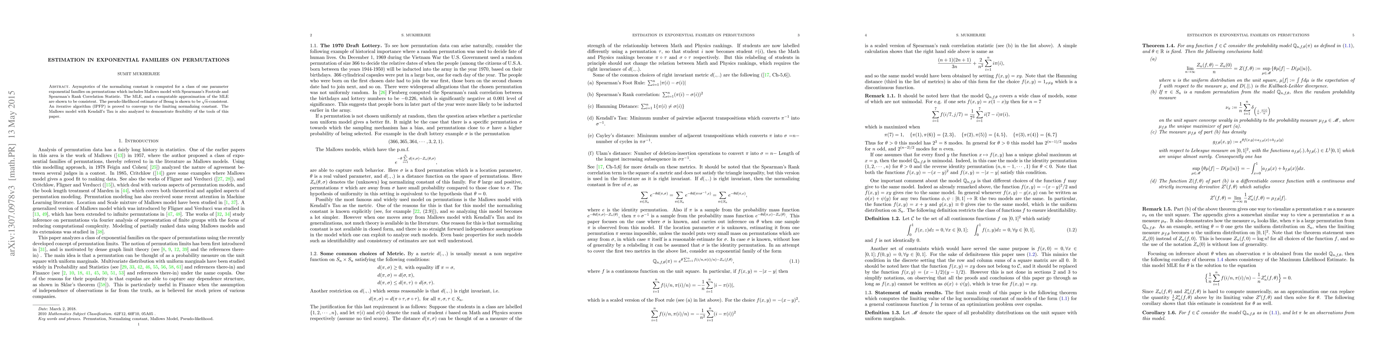 Asymptotics of the normalizing constant is computed for a class of one parameter exponential families on permutations which includes Mallows model with Spearmans's Footrule and Spearman's Rank Correlation Statistic. The MLE, and a computable approximation of the MLE are shown to be consistent. The pseudo-likelihood estimator of Besag is shown to be $\sqrt{n}$-consistent. An iterative algorithm (IPFP) is proved to converge to the limiting normalizing constant. The Mallows model with Kendall's Tau is also analyzed to demonstrate flexibility of the tools of this paper.