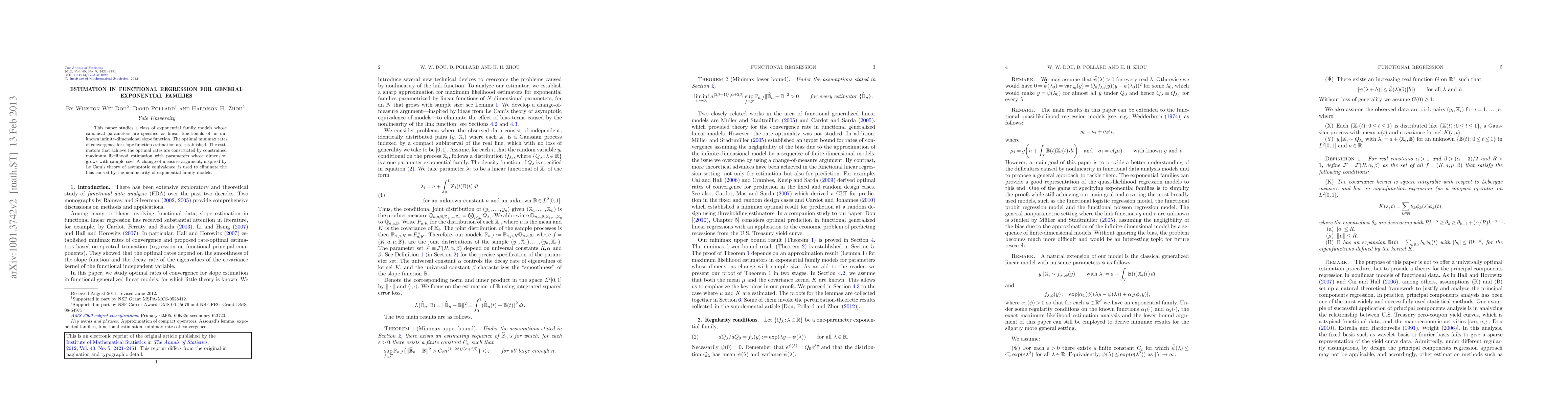 This paper studies a class of exponential family models whose canonical parameters are specified as linear functionals of an unknown infinite-dimensional slope function. The optimal minimax rates of convergence for slope function estimation are established. The estimators that achieve the optimal rates are constructed by constrained maximum likelihood estimation with parameters whose dimension grows with sample size. A change-of-measure argument, inspired by Le Cam's theory of asymptotic equivalence, is used to eliminate the bias caused by the nonlinearity of exponential family models.