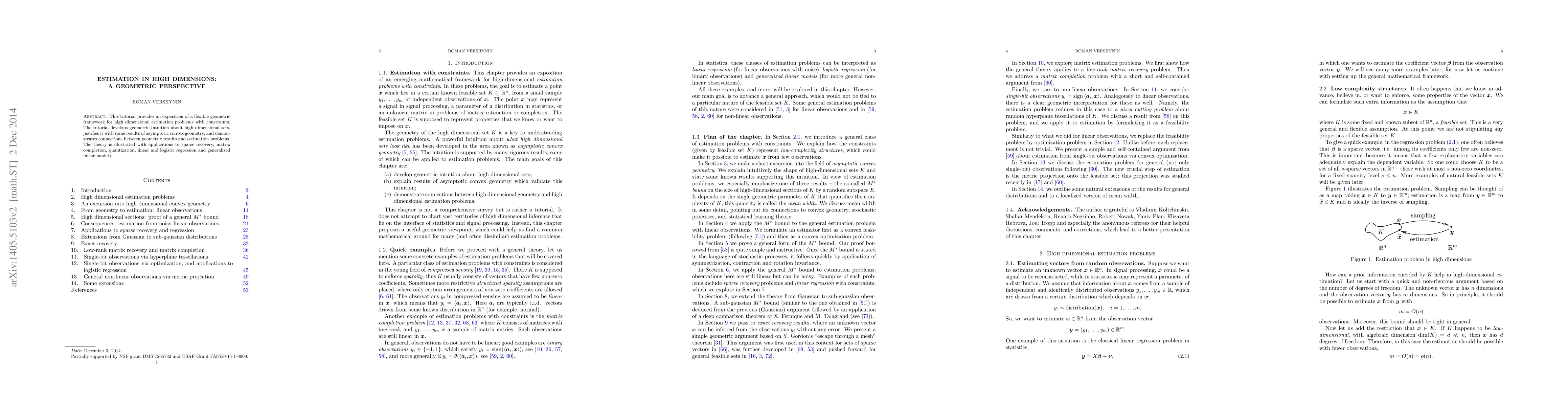 This tutorial provides an exposition of a flexible geometric framework for high dimensional estimation problems with constraints. The tutorial develops geometric intuition about high dimensional sets, justifies it with some results of asymptotic convex geometry, and demonstrates connections between geometric results and estimation problems. The theory is illustrated with applications to sparse recovery, matrix completion, quantization, linear and logistic regression and generalized linear models.