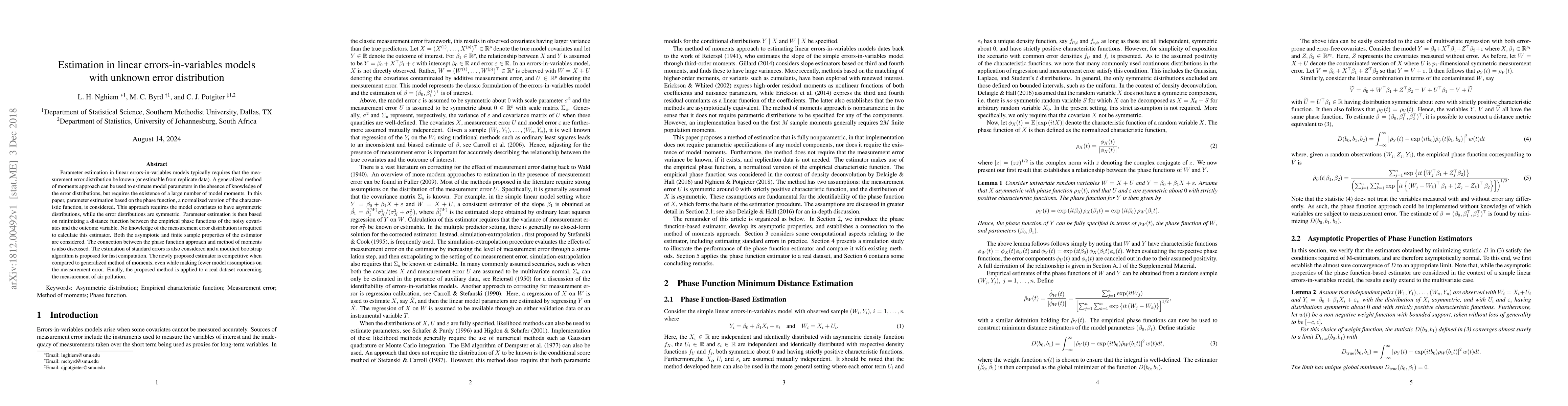 This paper proposes a novel parameter estimation method for linear errors-in-variables models without requiring knowledge of the measurement error distribution. It utilizes the phase function, minimizing the distance between empirical phase functions, and demonstrates competitive performance compared to the generalized method of moments.