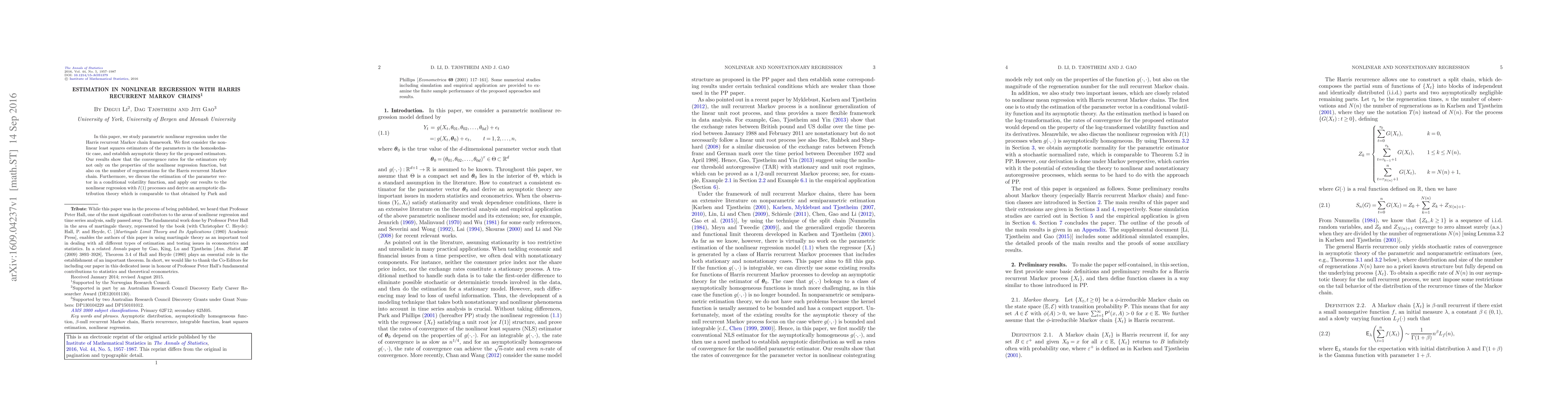 This paper investigates parametric nonlinear regression using Harris recurrent Markov chains, establishing asymptotic theory for nonlinear least squares estimators. The convergence rates depend on both the regression function properties and the Markov chain's regenerations, and it extends the results to conditional volatility functions and $I(1)$ processes, supported by numerical studies.