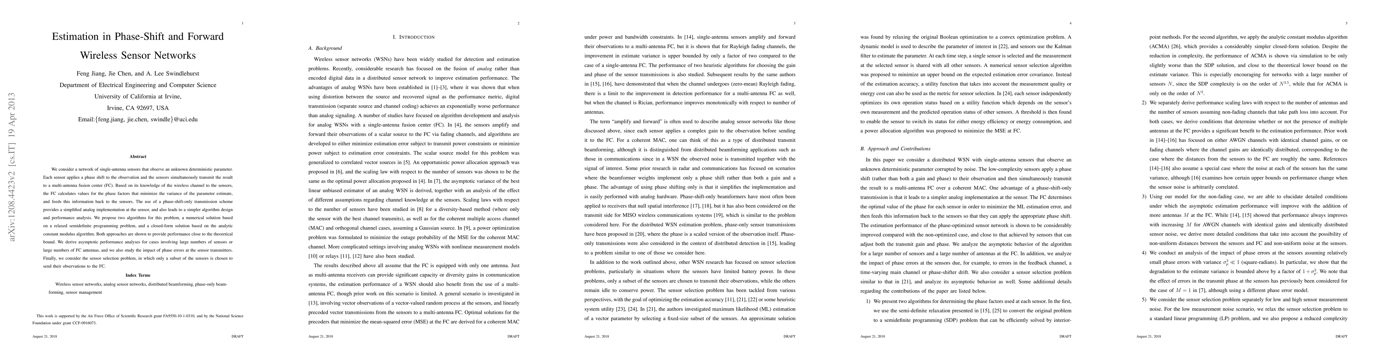 We consider a network of single-antenna sensors that observe an unknown deterministic parameter. Each sensor applies a phase shift to the observation and the sensors simultaneously transmit the result to a multi-antenna fusion center (FC). Based on its knowledge of the wireless channel to the sensors, the FC calculates values for the phase factors that minimize the variance of the parameter estimate, and feeds this information back to the sensors. The use of a phase-shift-only transmission scheme provides a simplified analog implementation at the sensor, and also leads to a simpler algorithm design and performance analysis. We propose two algorithms for this problem, a numerical solution based on a relaxed semidefinite programming problem, and a closed-form solution based on the analytic constant modulus algorithm. Both approaches are shown to provide performance close to the theoretical bound. We derive asymptotic performance analyses for cases involving large numbers of sensors or large numbers of FC antennas, and we also study the impact of phase errors at the sensor transmitters. Finally, we consider the sensor selection problem, in which only a subset of the sensors is chosen to send their observations to the FC.