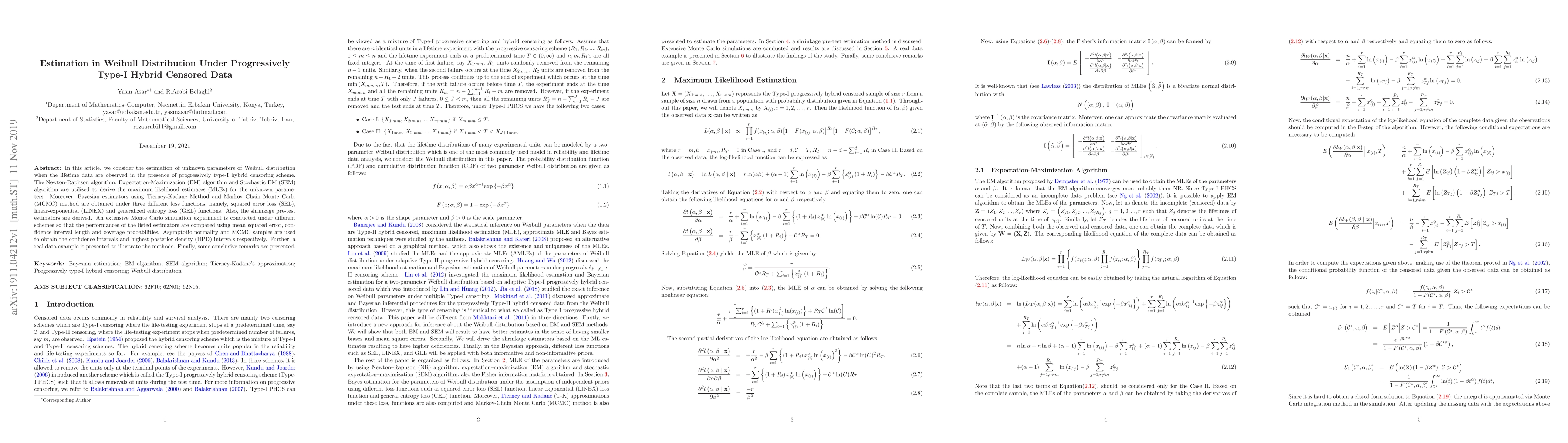 The paper presents a detailed analysis of MLE and Bayesian estimation techniques for Weibull distribution parameters under progressively type-I hybrid censoring, including shrinkage pre-test estimators.