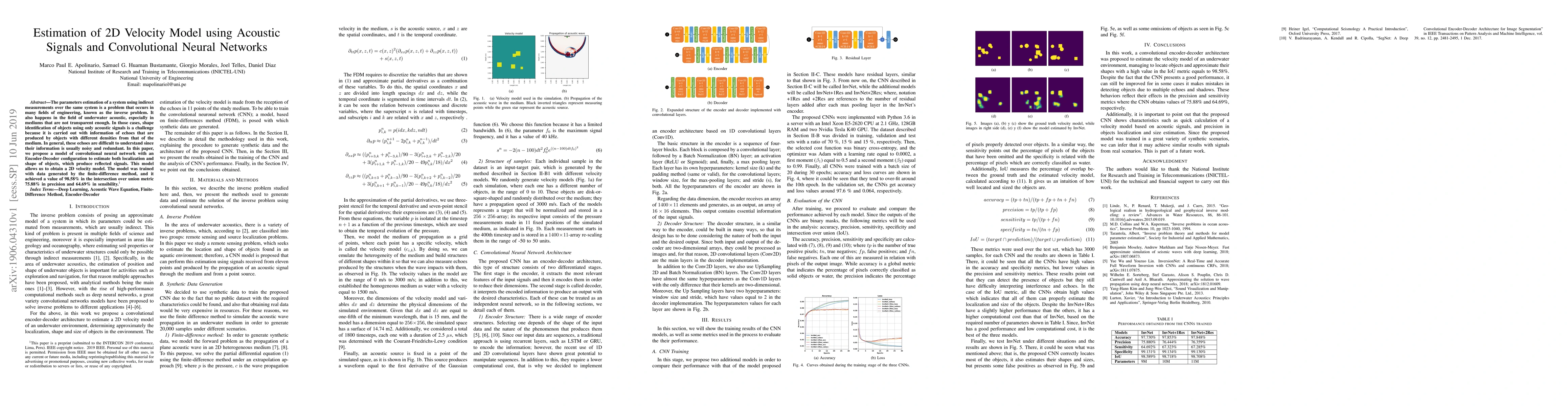 Researchers developed a convolutional neural network to estimate 2D velocity models from acoustic signals, achieving high accuracy in object localization and shape estimation. The model outperformed traditional methods with an intersection over union metric of 98.58%.