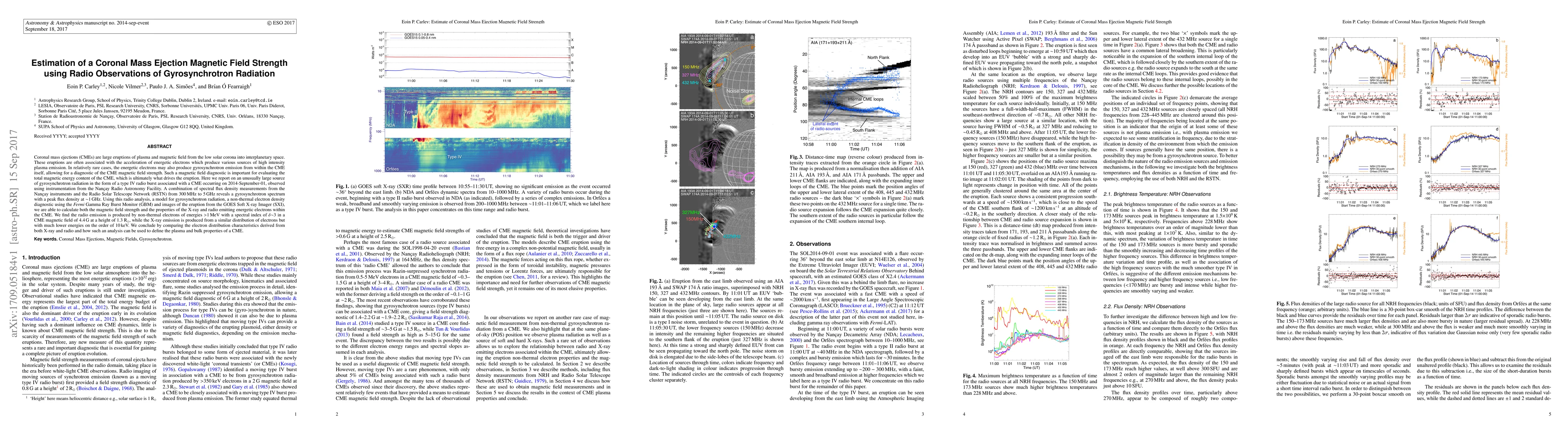 This paper estimates the magnetic field strength of a coronal mass ejection (CME) using gyrosynchrotron radiation observed in a type IV radio burst. The analysis, combining spectral flux density measurements and imaging data, reveals a magnetic field of 4.4 G at 1.3 solar radii, with non-thermal electrons producing both radio and X-ray emissions.